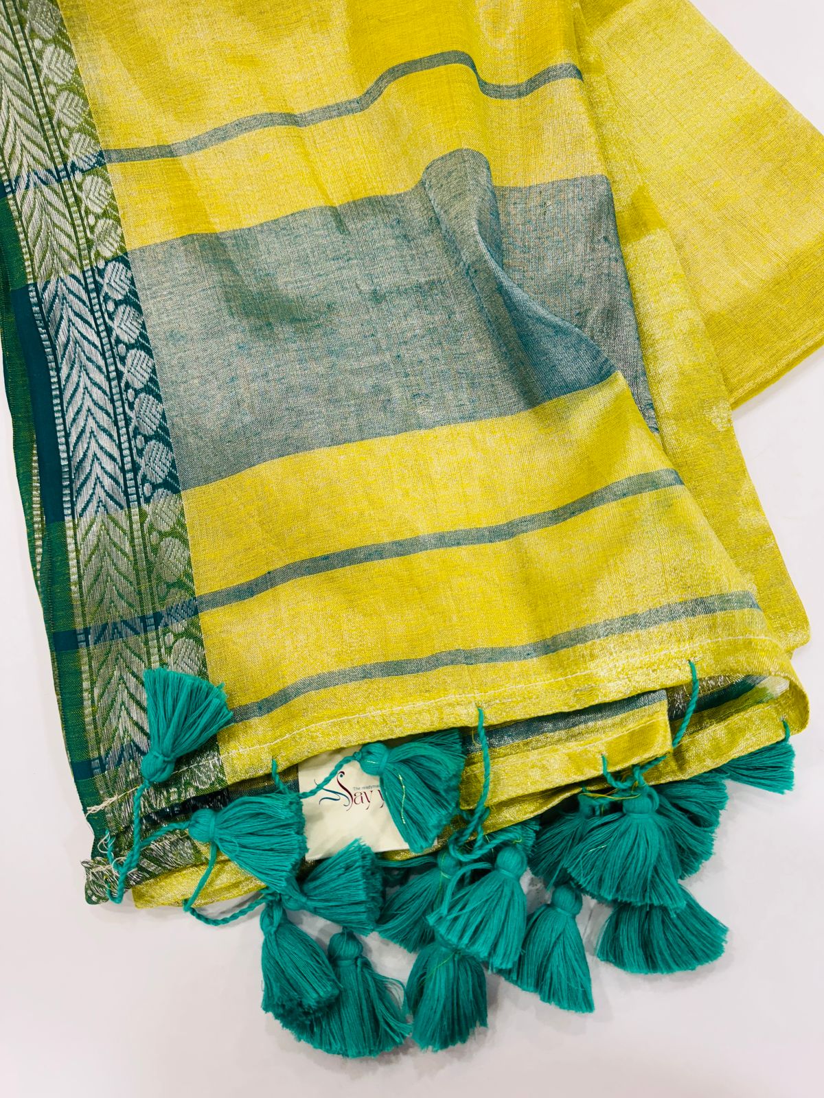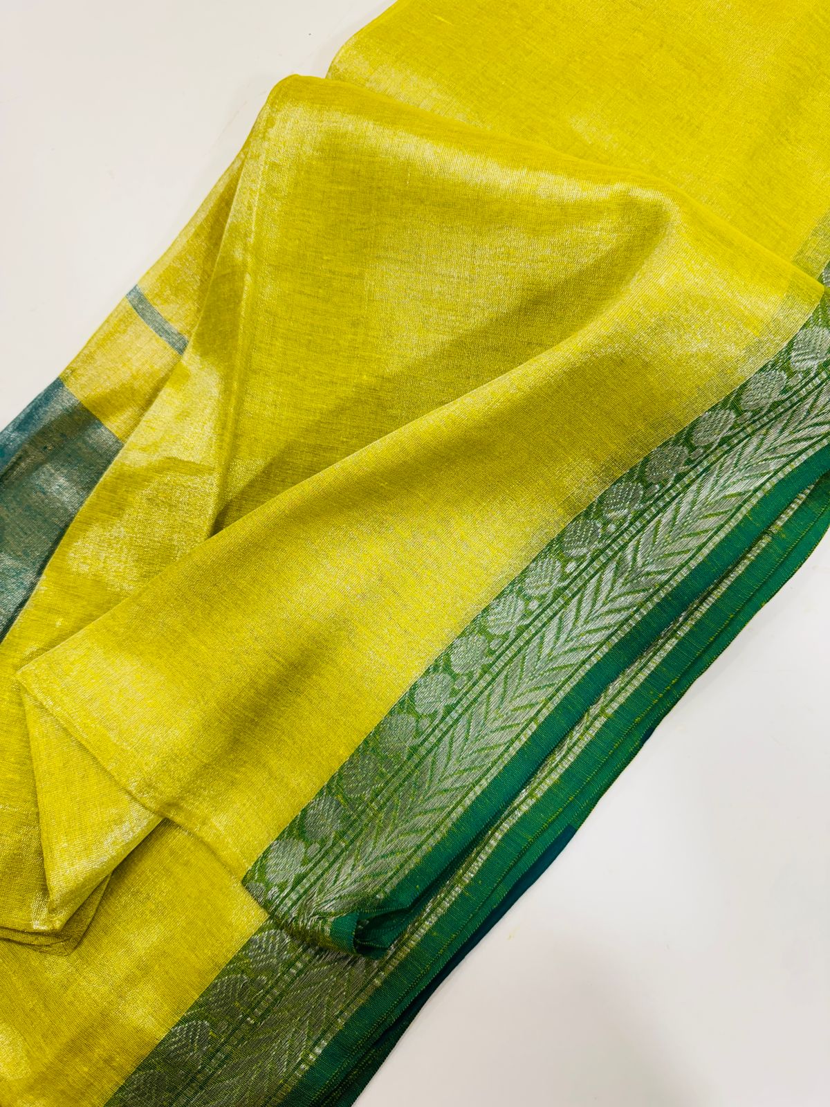 This exquisite handloom tissue Mul cotton saree, aptly named Raaga, for the way it flows captivating blend of two tones that shimmer elegantly under light. Woven with care, the tissue Mul cotton fabric offers a lightweight and breathable feel, making it perfect for both festive occasions and casual elegance. The saree’s delicate fringed edges add a touch of tradition, while its luxurious texture and iridescent finish bring a modern sophistication to the ensemble. A true masterpiece of artisanal craftsmanship, this saree is as comfortable as it is stunning, embodying the timeless grace of handloom artistry.