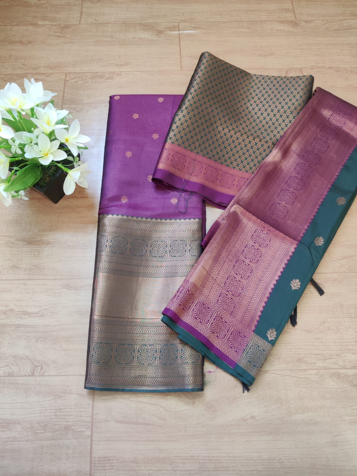 Our Ready to wear Half saree in Semi silk comes with Pleated and stitched banarasi wrinkle free skirt with Pleated Semi silk Dhavani attached to the skirt that is in contrast to the skirt. With beautiful Zari woven buttas.