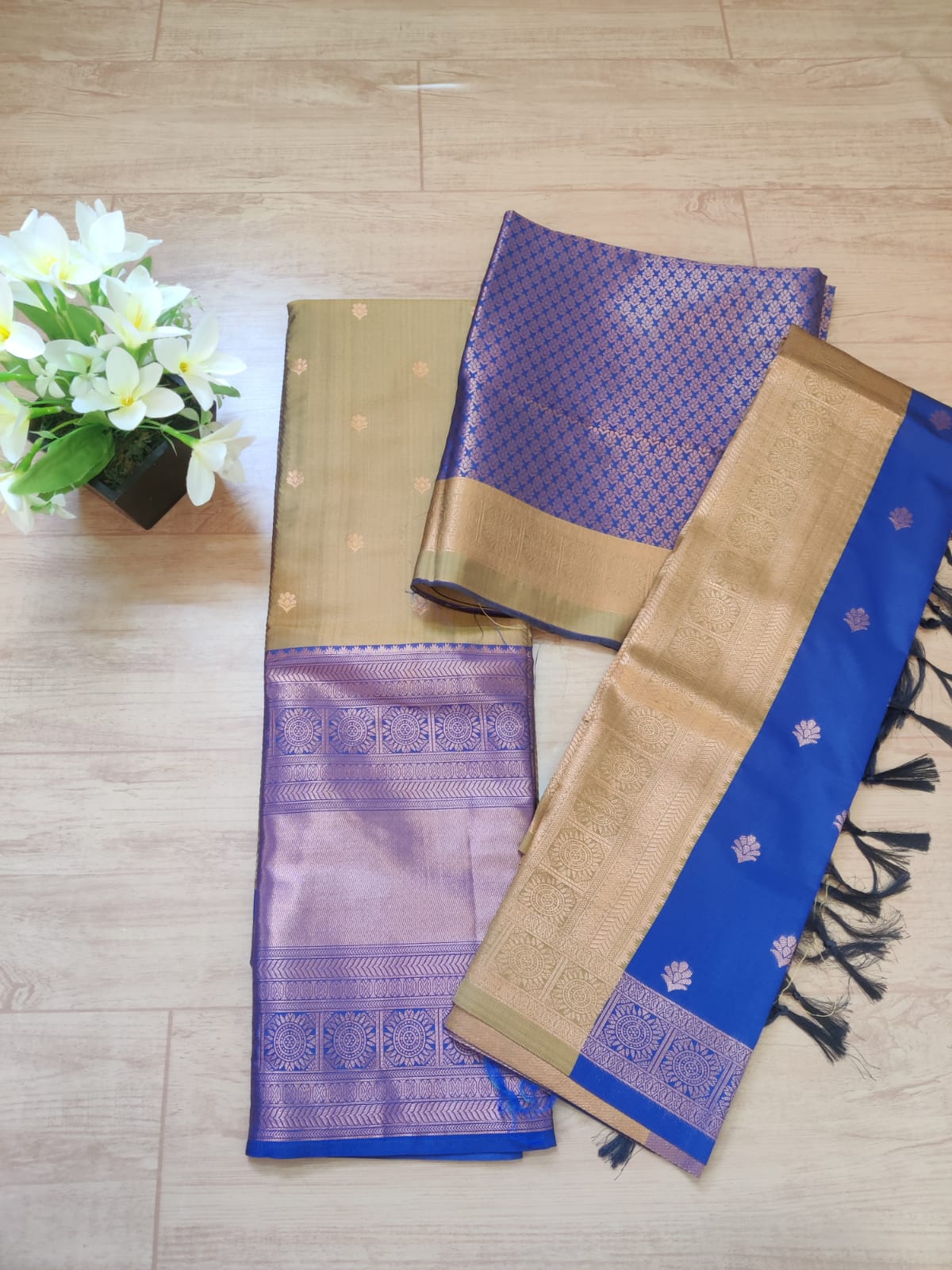 Our Ready to wear Half saree in Semi silk comes with Pleated and stitched banarasi wrinkle free skirt with Pleated Semi silk Dhavani attached to the skirt that is in contrast to the skirt. With beautiful Zari woven buttas.