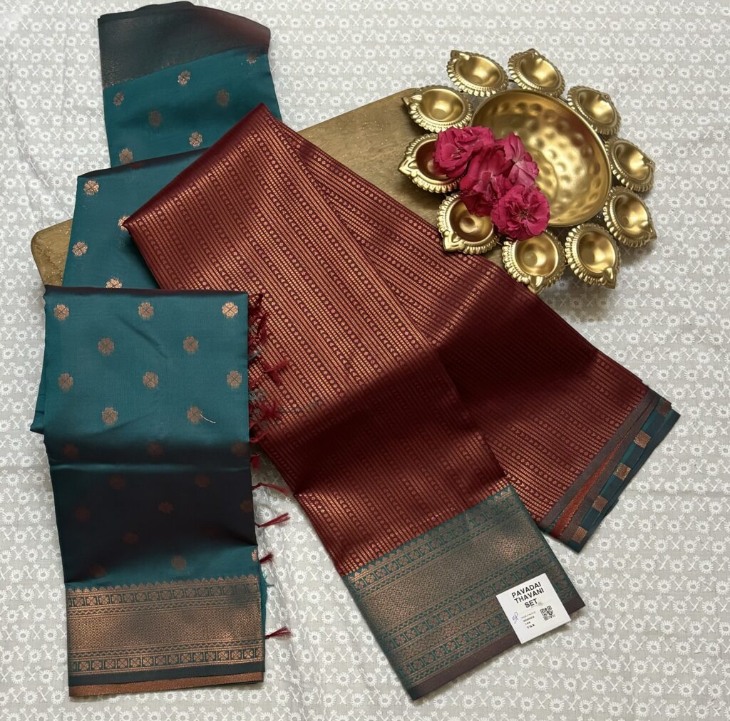 Our Ready to wear Half saree in Semi silk comes with Pleated and stitched banarasi wrinkle free skirt with Pleated Semi silk Dhavani attached to the skirt that is in contrast to the skirt. With beautiful Zari woven buttas.