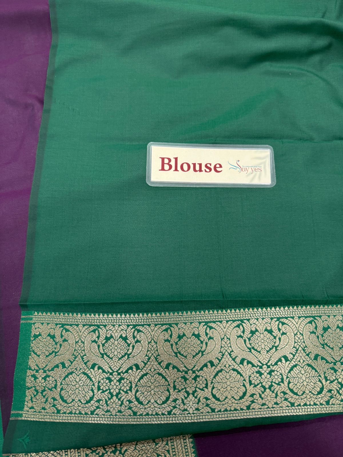 - Border & Pallu: Contrast Emerald Green with rich gold zari weaving