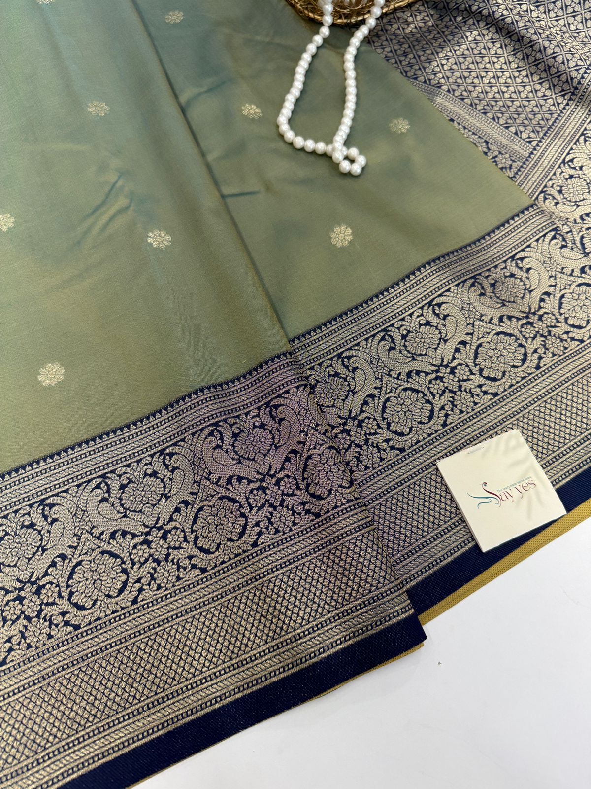 - Border & Pallu: Contrast Emerald Green with rich gold zari weaving