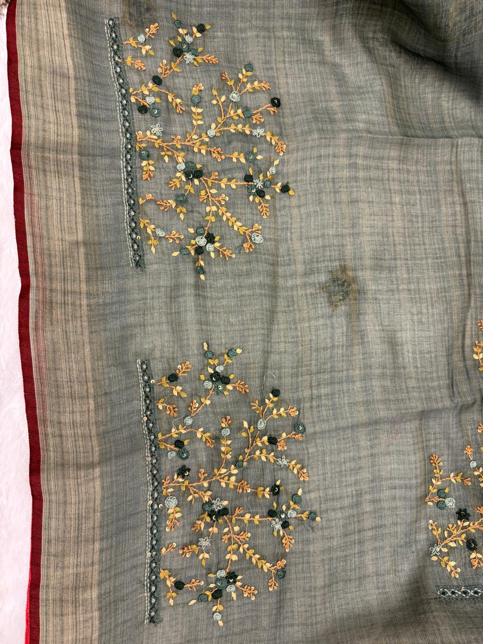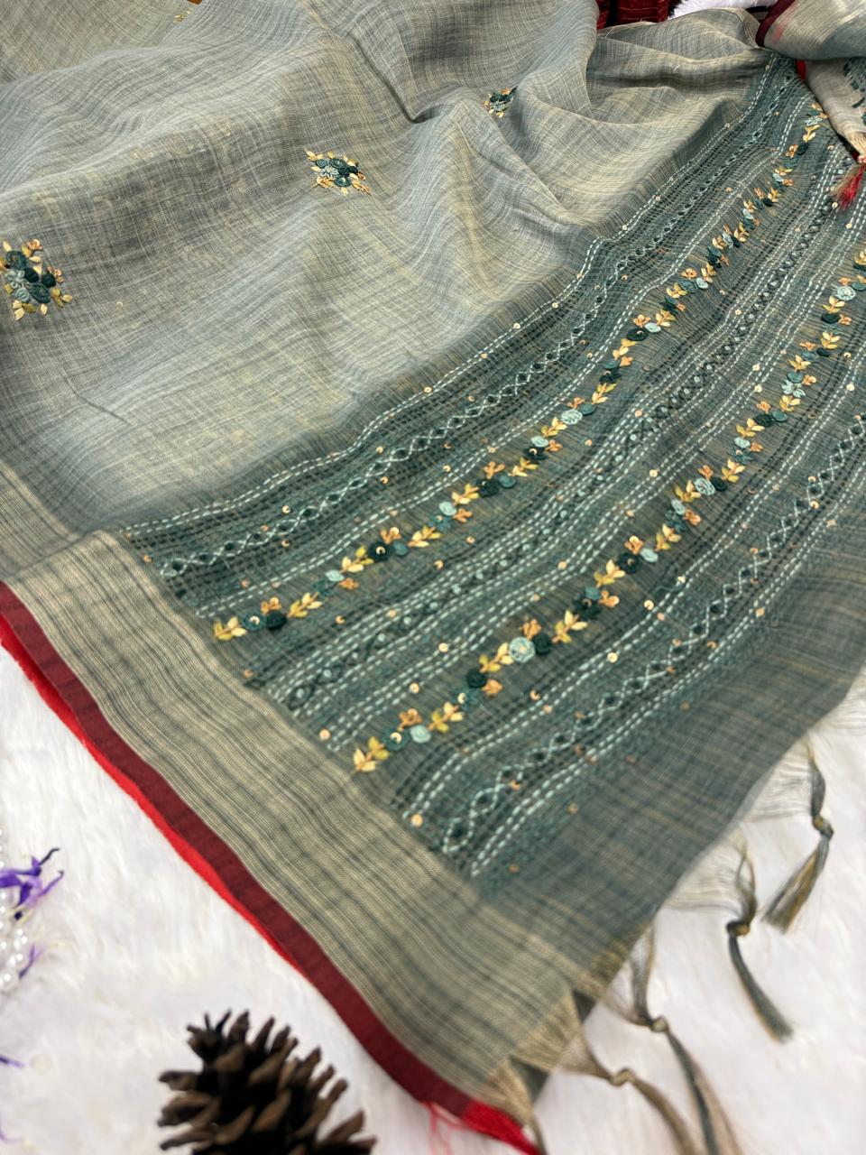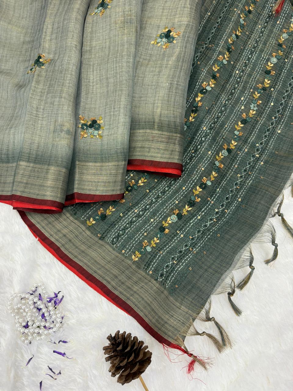 Sage green saree with French knots in Linen silk