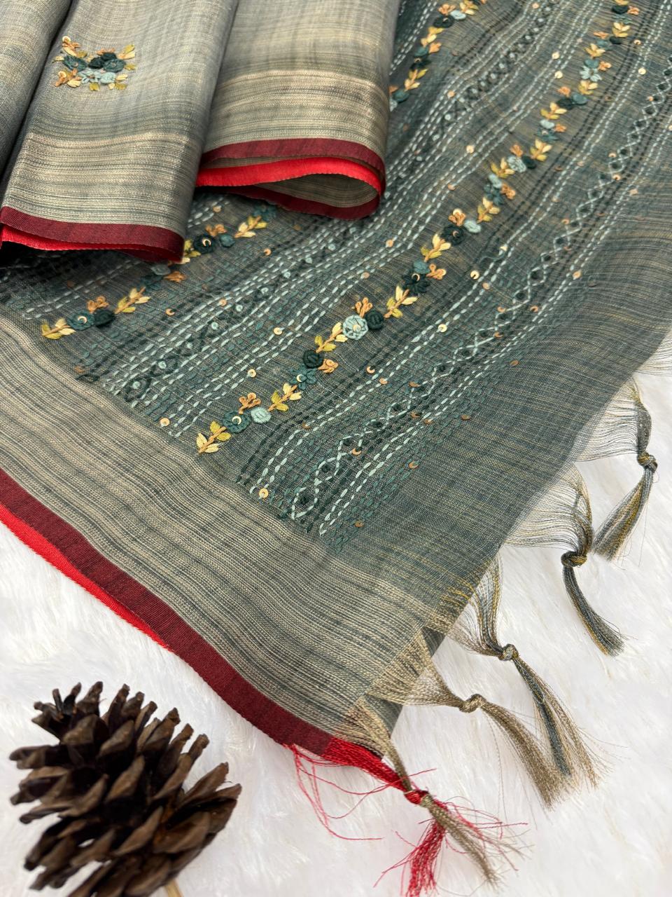 Elevate your ethnic charm with this Handloom organic linen silk Saree, a delicate masterpiece blending tradition and elegance. The sage green base and muted intricate floral french knots, reminiscent of Mughal-era artistry. The finely woven fabric offers a lightweight and airy drape, making it perfect for all-day wear. The saree is accentuated with bold red tassels at the pallu, adding a playful yet sophisticated touch.