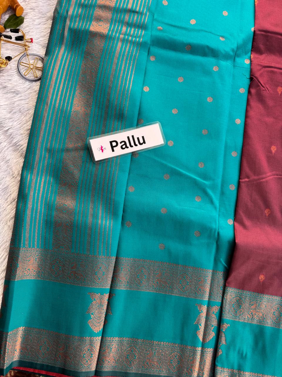 Saraswati is a beautiful, traditional soft silk saree in a rich shade of maroon with delicate zari woven motifs woven across the body. The border features a very traditional retta patta designs in black and reddish-brown hues, showcasing fine craftsmanship with patterns annaparavai and other ornamental elements. The texture of the fabric is smooth and lustrous, making it ideal for special occasions such as weddings or festivals. The saree combines elegance with a classic look, perfect for someone seeking a refined and sophisticated style.