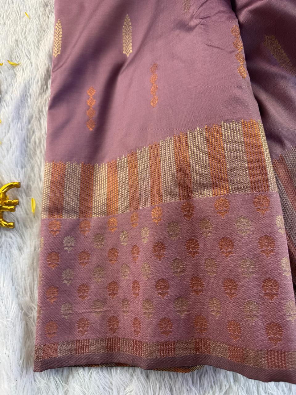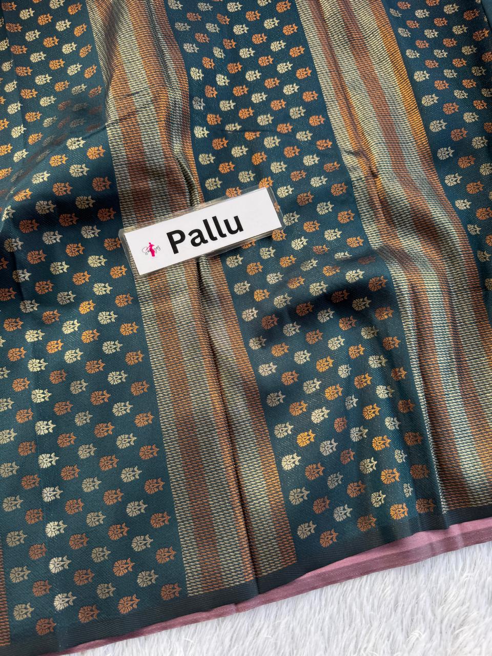 Saraswati is a beautiful, traditional soft silk saree in a rich shade with delicate zari woven motifs woven across the body. The texture of the fabric is smooth and lustrous, making it ideal for special occasions such as weddings or festivals. The saree combines elegance with a classic look, perfect for someone seeking a refined and sophisticated style.