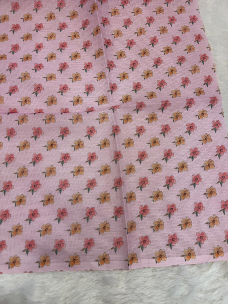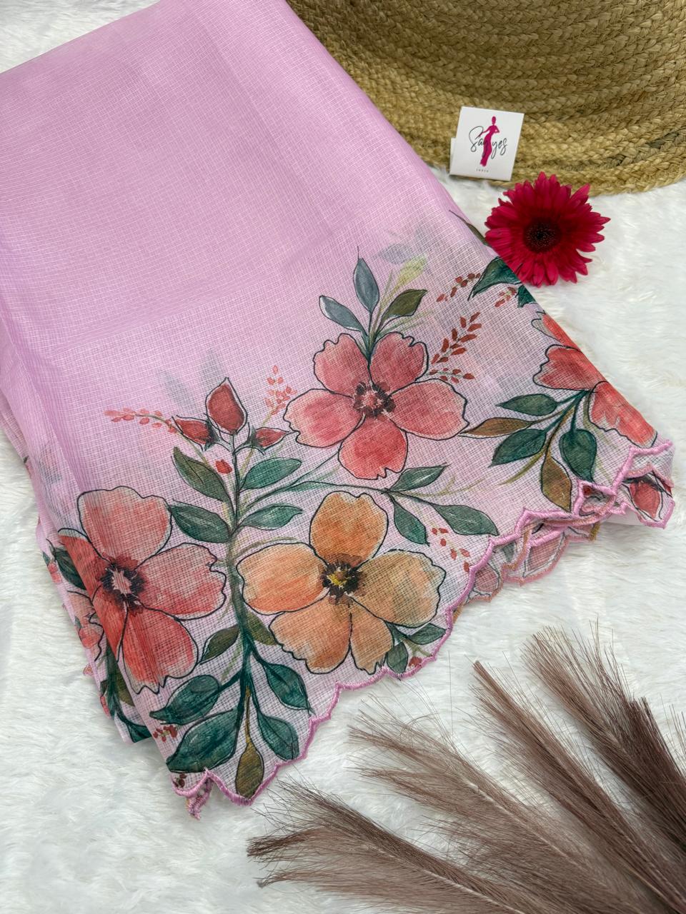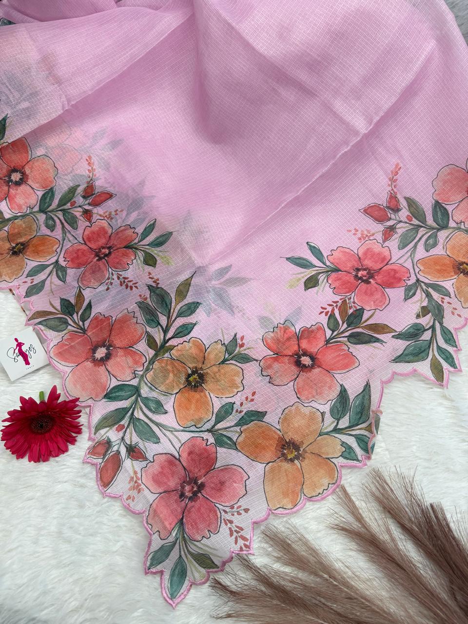 Embrace elegance with this pastel green Hand-Painted Kota Silk Saree, a delicate fusion of airy comfort and artistic charm. Crafted from the finest Kota silk, this saree features a lightweight, sheer texture that drapes effortlessly. The highlight of this masterpiece is its hand-painted floral border, adorned with vibrant hues of peach, coral, and green, adding a touch of nature’s grace to your ensemble. The scalloped edges enhance its feminine appeal, making it perfect for daytime events, summer festivities, or casual chic styling.