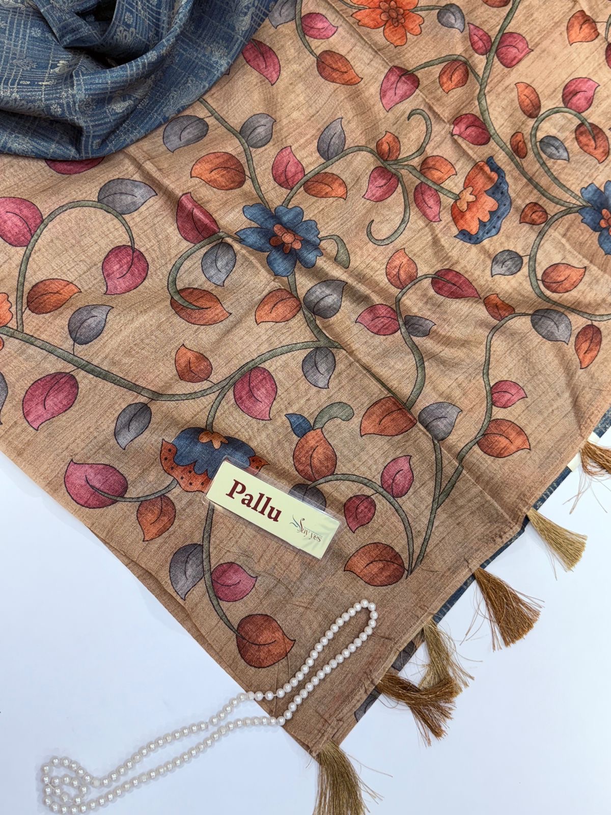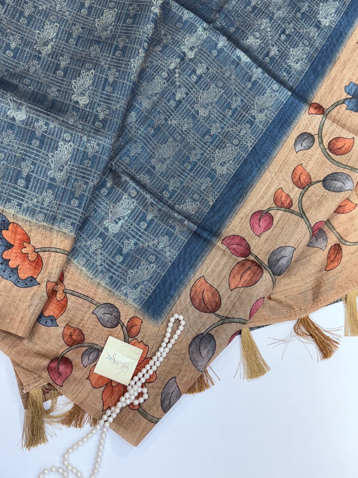 The border and pallu unfold in a soft grey tone, digitally printed with floral patterns in terracotta, rose, and ochre — a graceful contrast that brings the saree to life. Lightweight yet lustrous, Tamarind Tales drapes beautifully, carrying the quiet luxury of tussar with the finesse of contemporary design.