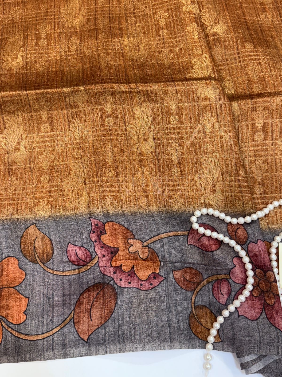 The border and pallu unfold in a soft grey tone, digitally printed with floral patterns in terracotta, rose, and ochre — a graceful contrast that brings the saree to life. Lightweight yet lustrous, Tamarind Tales drapes beautifully, carrying the quiet luxury of tussar with the finesse of contemporary design.