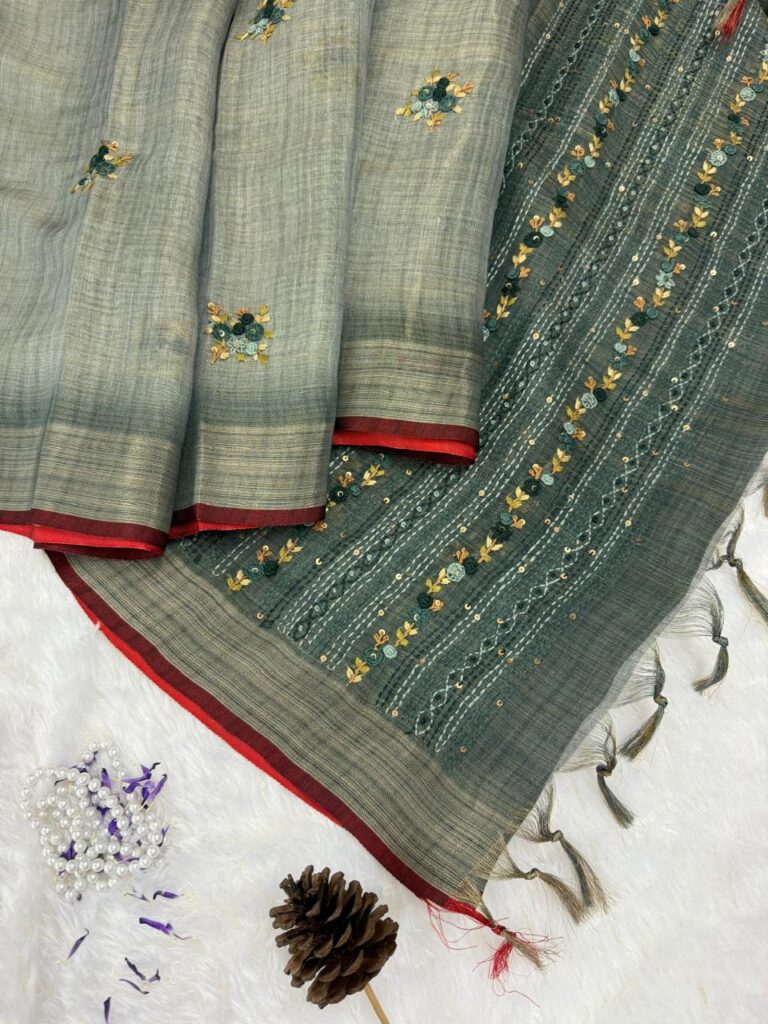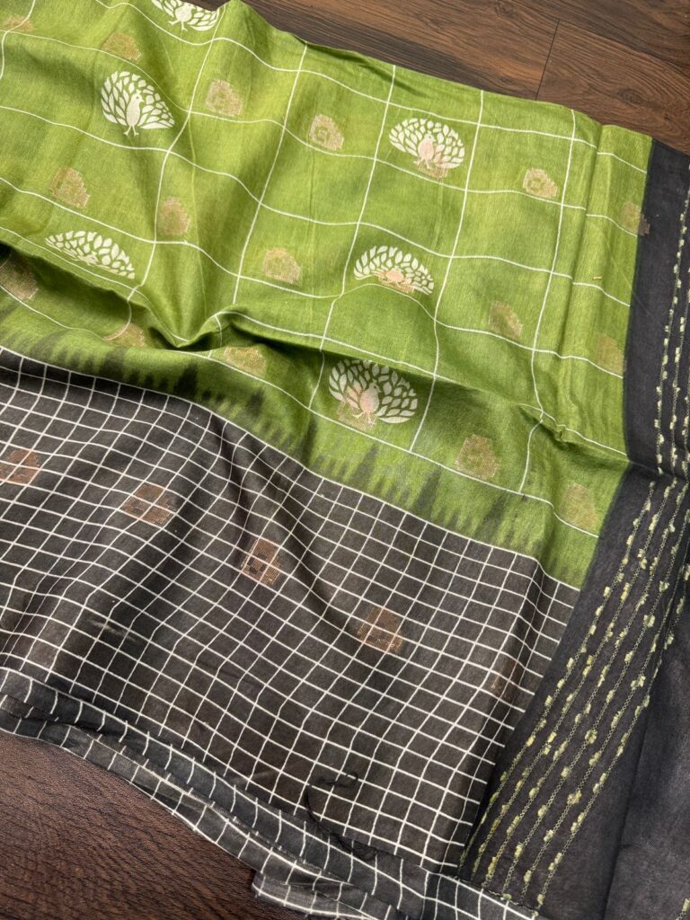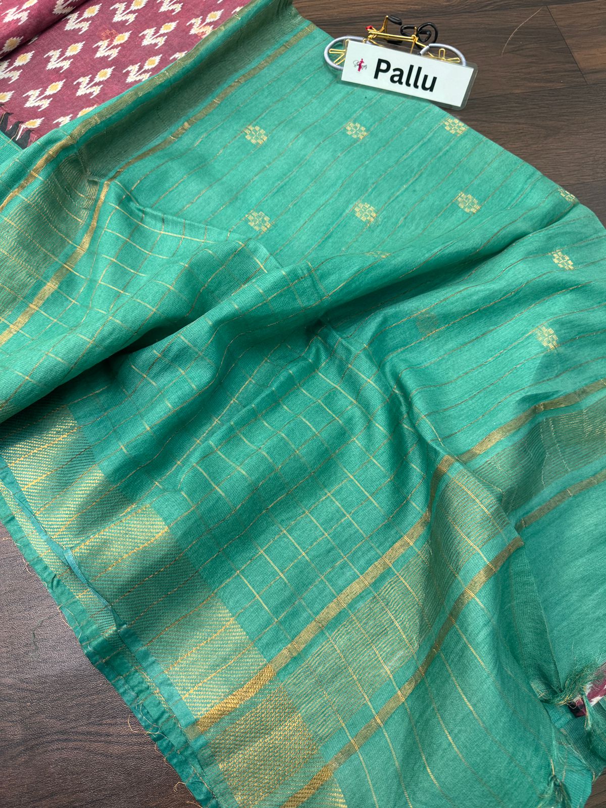 Drape yourself in the vibrant elegance of the Semi tussar silk Saree, a beautiful fusion of nature’s charm and traditional craftsmanship. This exquisite saree is adorned with beautiful ikkat floral blossoms and lovely zari woven checkers on the border and pallu. The contrasting pleats, woven in rich hues and adorned with intricate floral patterns, create a striking visual appeal. Crafted from luxurious Tussar fabric, this saree offers a perfect blend of comfort and grace, making it ideal for both festive occasions and casual wear. The pallu flows seamlessly, complementing the design with its delicate zari work. Embrace the spirit of nature with every drape and make a statement with the Vanika Saree.