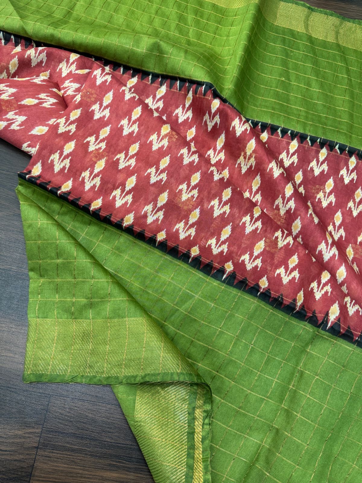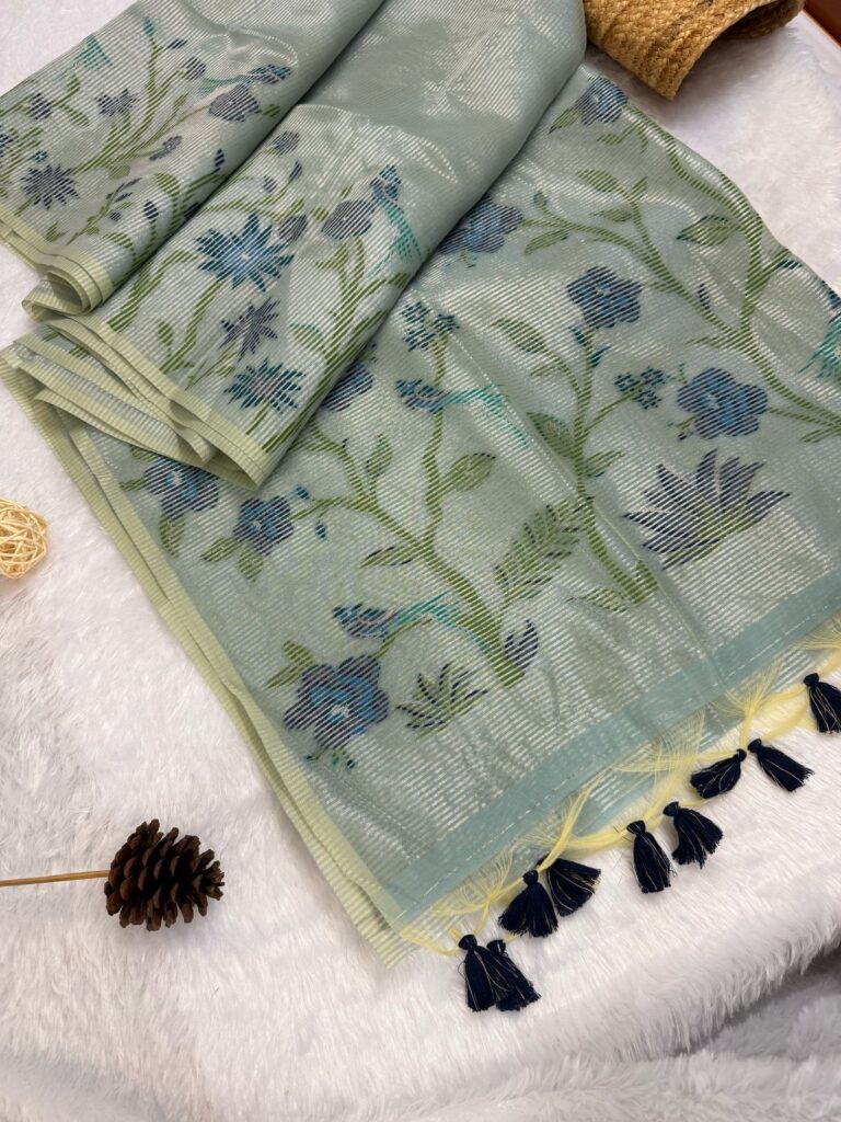 Drape yourself in the vibrant elegance of the Semi tussar silk Saree, a beautiful fusion of nature’s charm and traditional craftsmanship. This exquisite saree is adorned with beautiful ikkat floral blossoms and lovely zari woven checkers on the border and pallu. The contrasting pleats, woven in rich hues and adorned with intricate floral patterns, create a striking visual appeal. Crafted from luxurious Tussar fabric, this saree offers a perfect blend of comfort and grace, making it ideal for both festive occasions and casual wear. The pallu flows seamlessly, complementing the design with its delicate zari work. Embrace the spirit of nature with every drape and make a statement with the Vanika Saree.