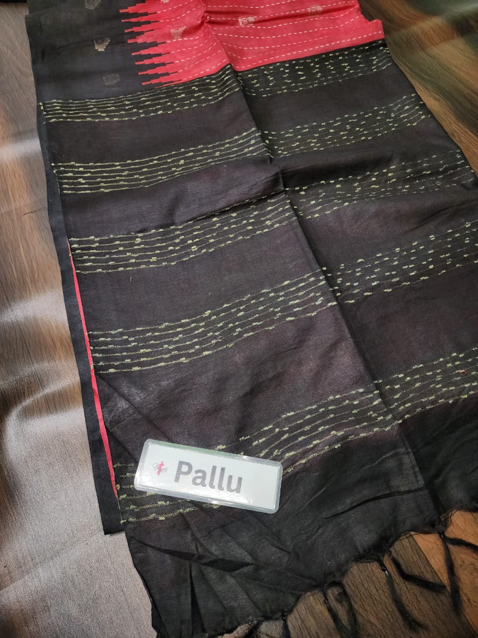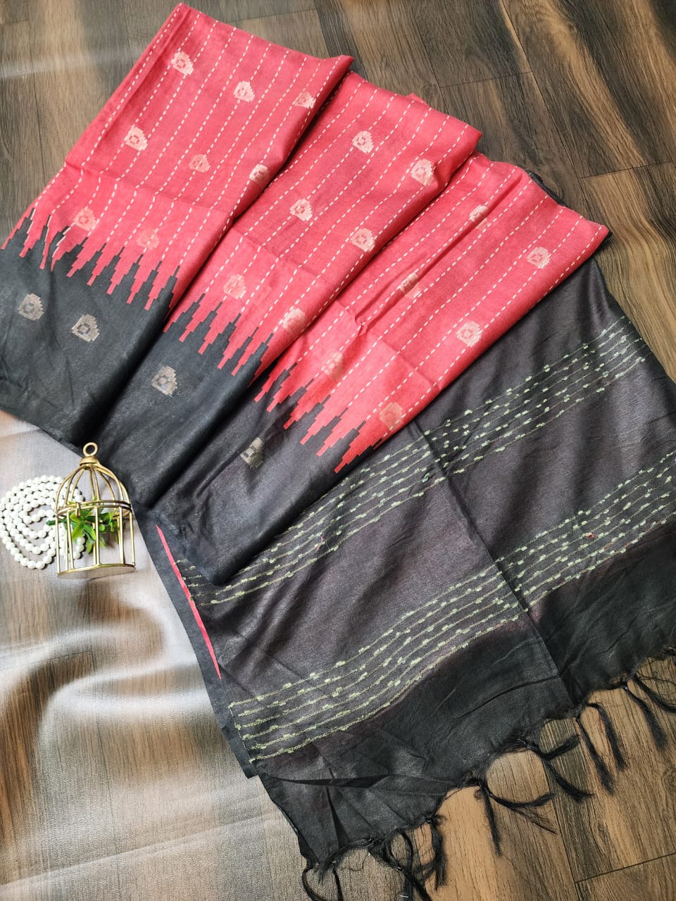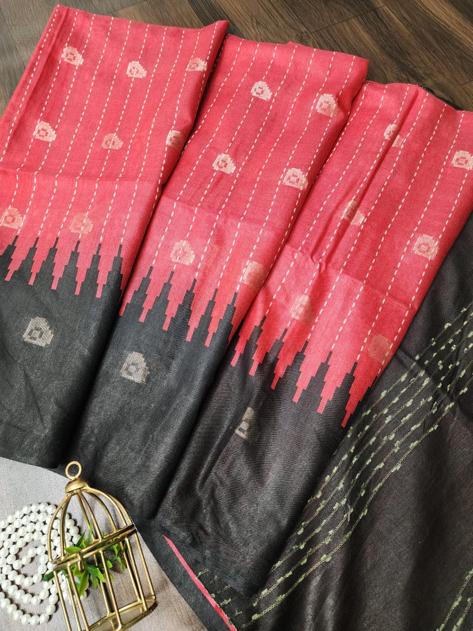 Drape yourself in the vibrant elegance of the Semi tussar silk Saree, a beautiful fusion of nature’s charm and traditional craftsmanship. This exquisite saree is adorned with beautiful ikkat floral blossoms and lovely zari woven checkers on the border and pallu. The contrasting pleats, woven in rich hues and adorned with intricate floral patterns, create a striking visual appeal. Crafted from luxurious Tussar fabric, this saree offers a perfect blend of comfort and grace, making it ideal for both festive occasions and casual wear. The pallu flows seamlessly, complementing the design with its delicate zari work. Embrace the spirit of nature with every drape and make a statement with the Vanika Saree.