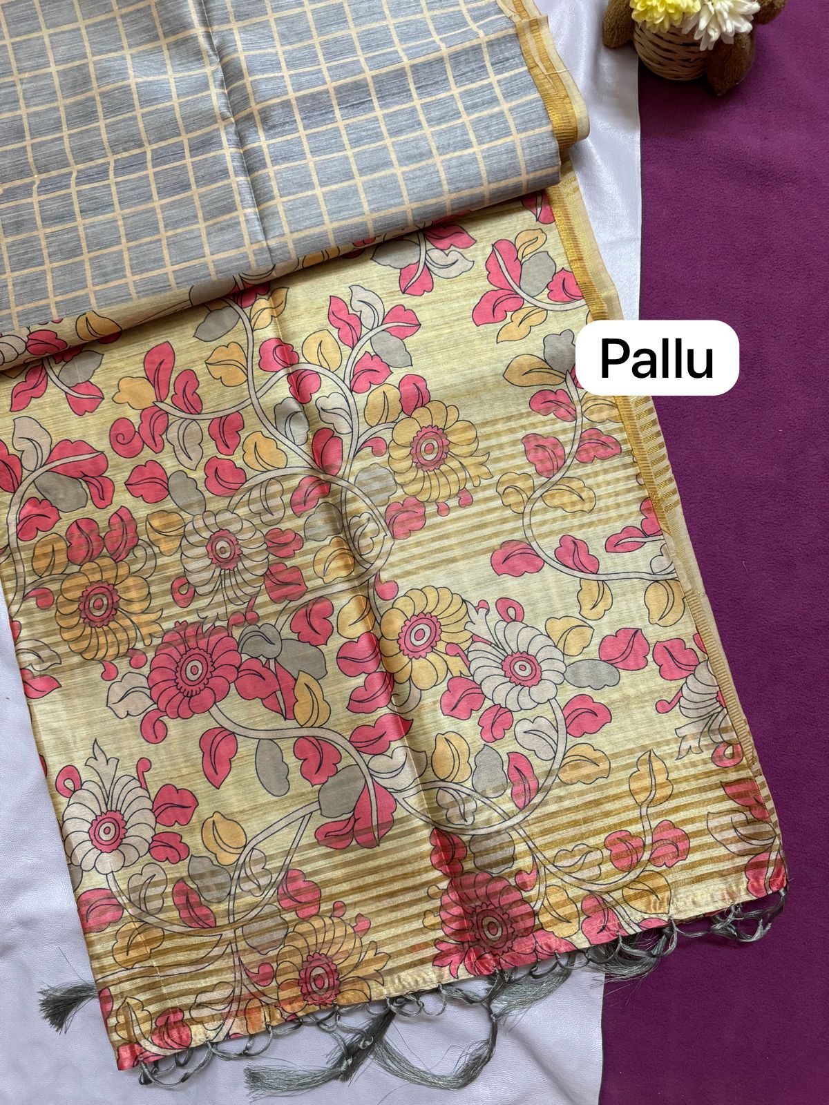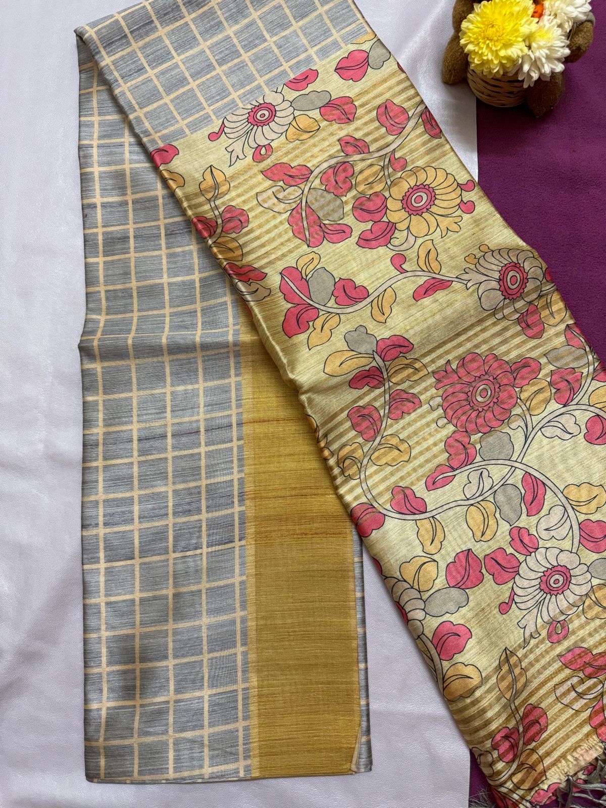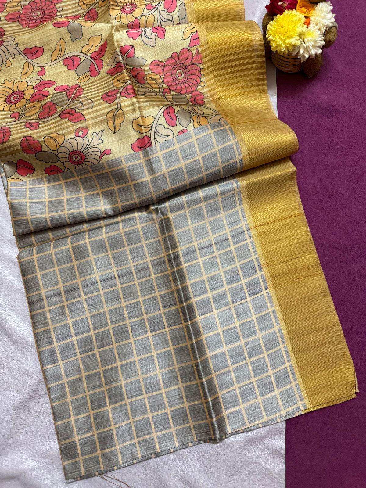 Semi Tussar with checkers and florals- SY100