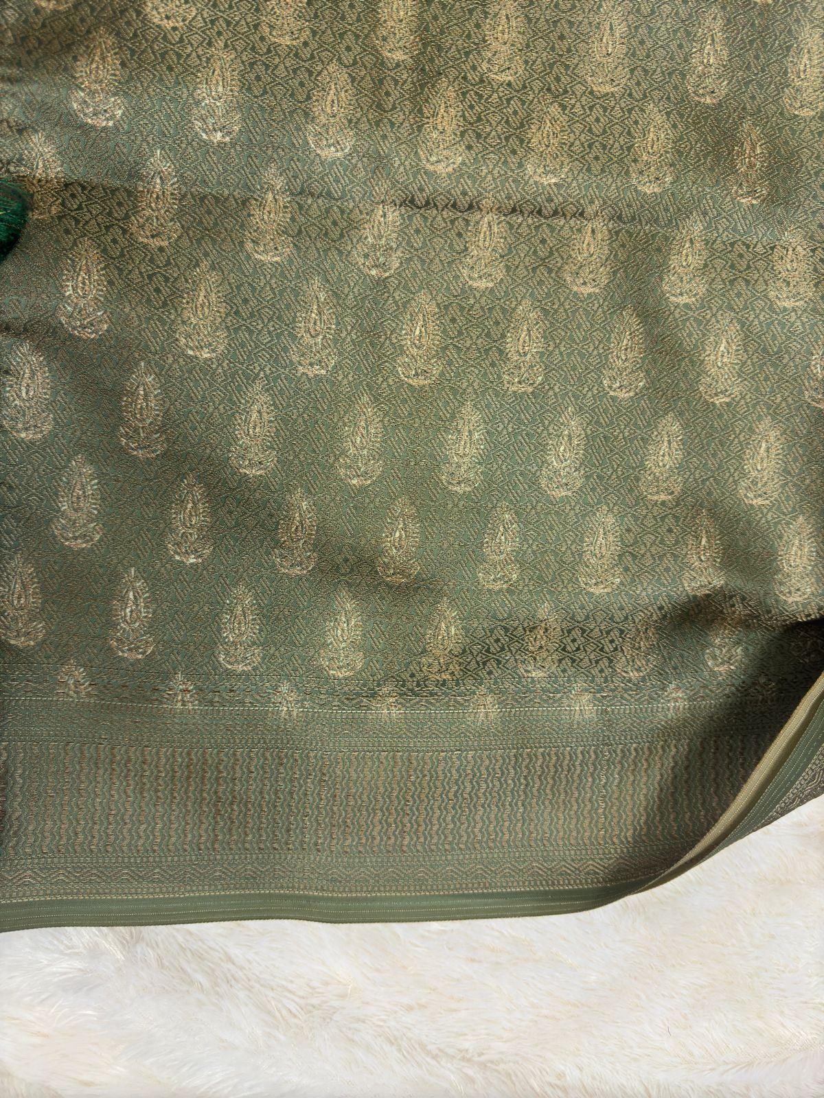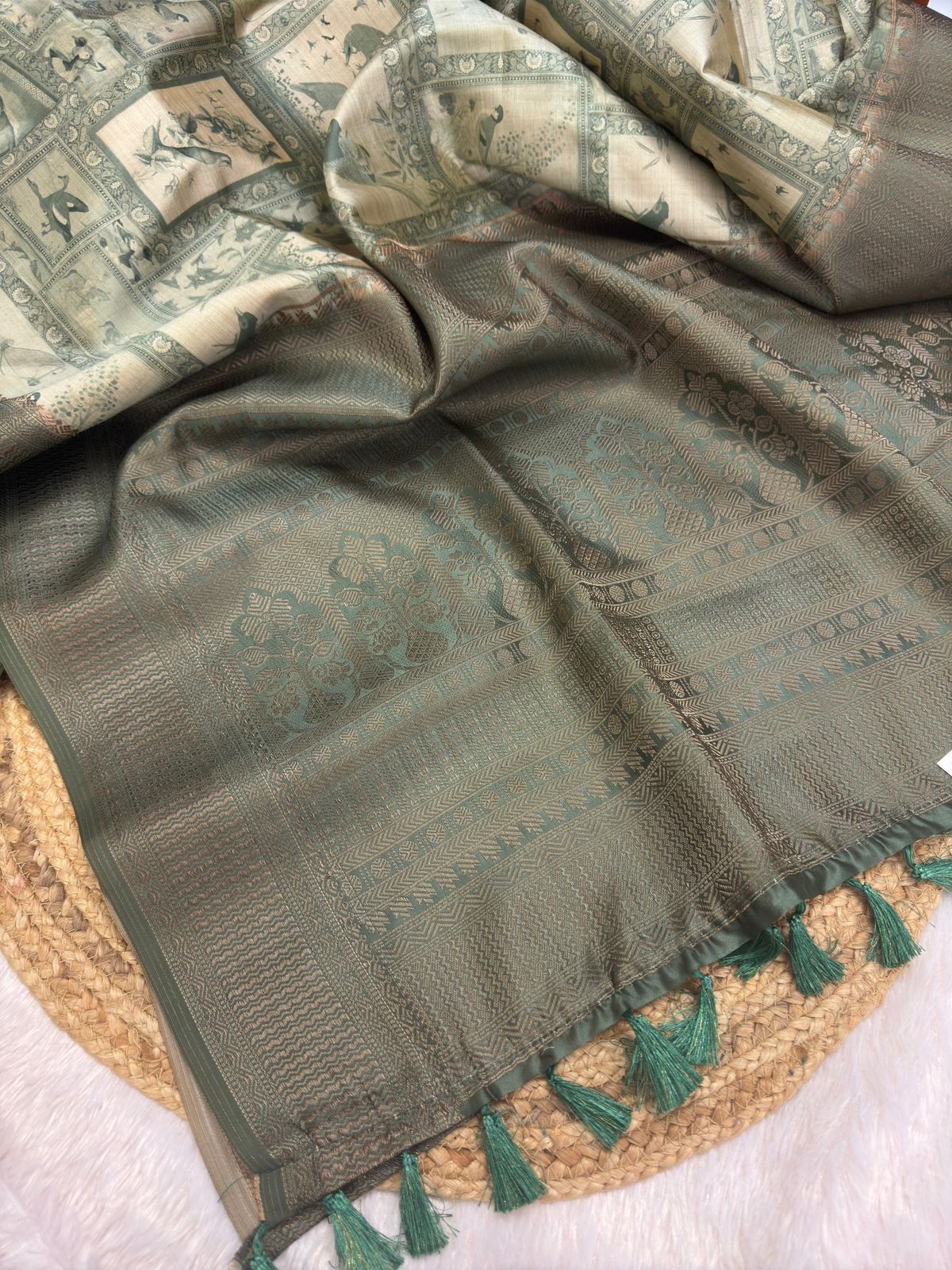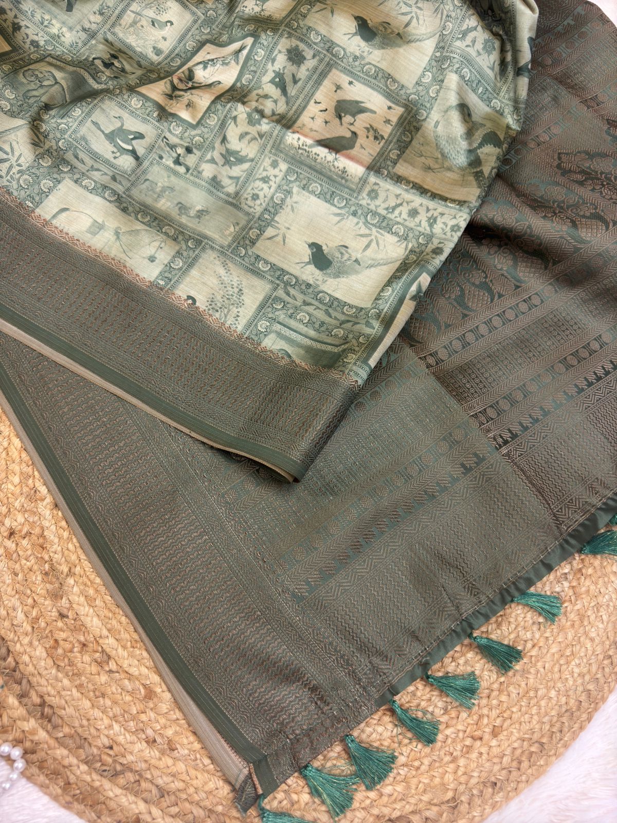 This elegant saree is a timeless blend of tradition and contemporary charm. The deep green body, adorned with a serene floral print, exudes a vintage allure. Complementing the floral motifs is a rich, intricately woven golden-brown zari border, adding a regal touch to the ensemble. The pallu features exquisite tassels in teal, enhancing the saree’s overall appeal with a playful flair.