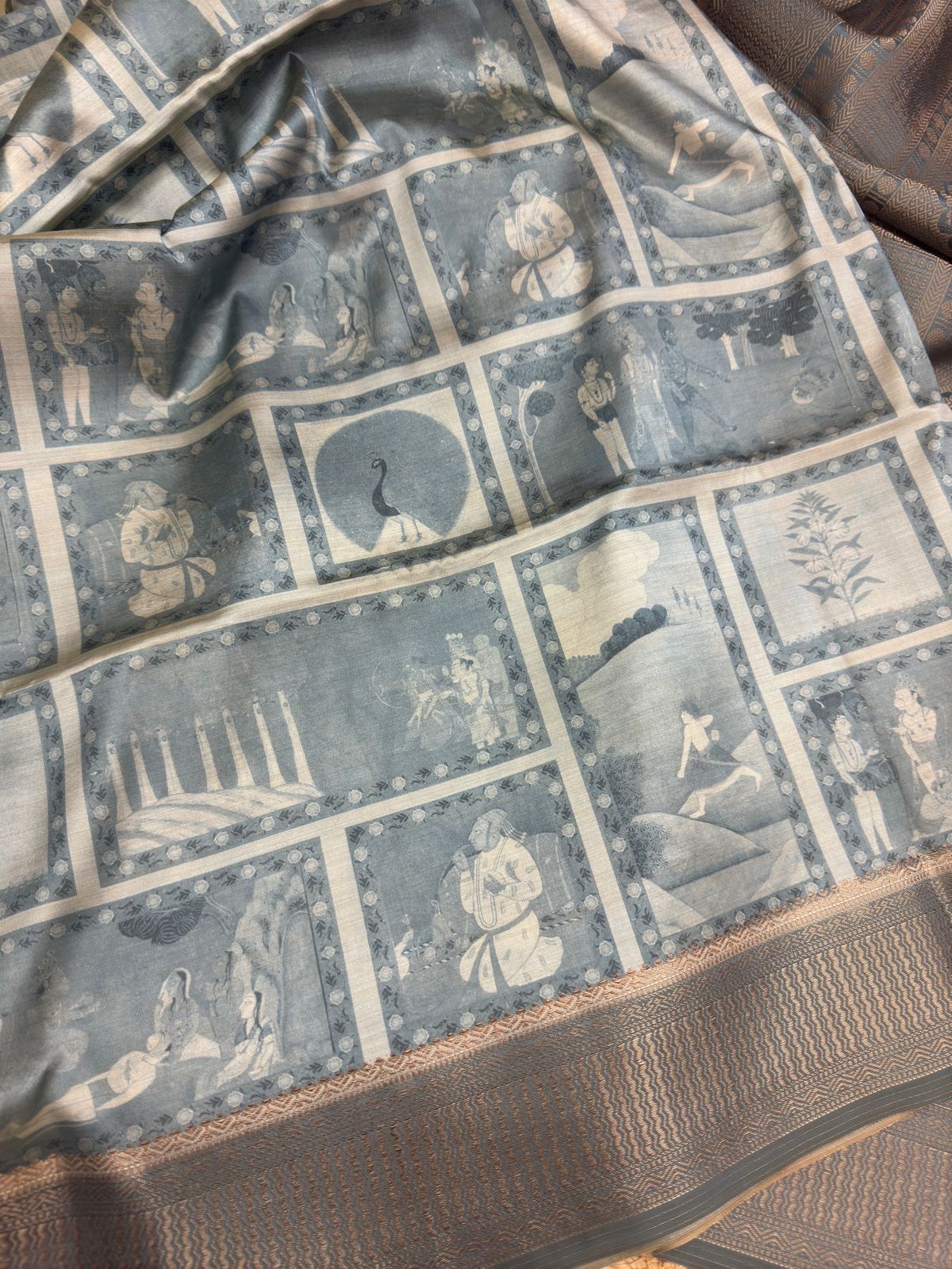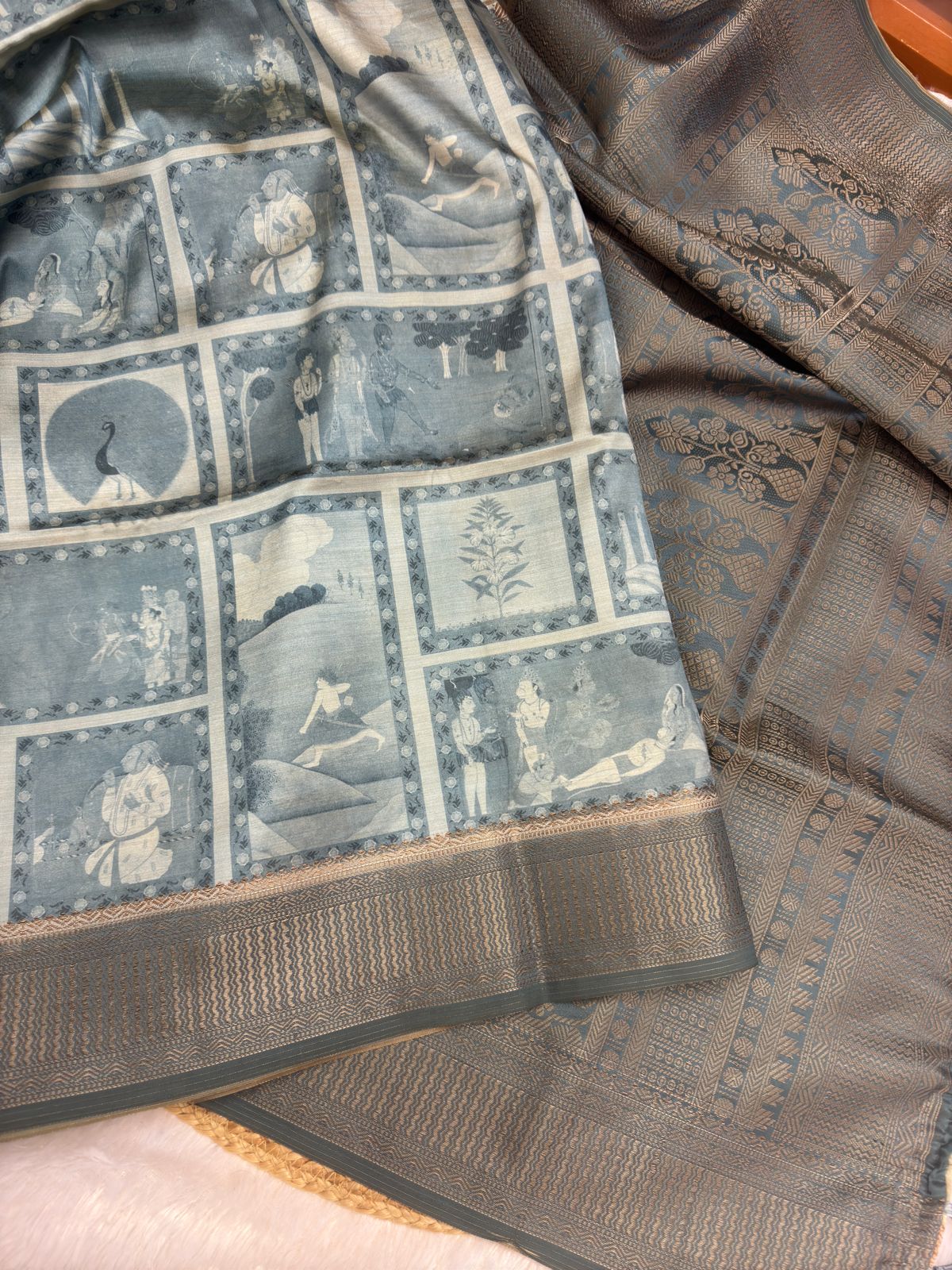 This elegant saree is a timeless blend of tradition and contemporary charm. The deep green body, adorned with a serene floral print, exudes a vintage allure. Complementing the floral motifs is a rich, intricately woven golden-brown zari border, adding a regal touch to the ensemble. The pallu features exquisite tassels in teal, enhancing the saree’s overall appeal with a playful flair.