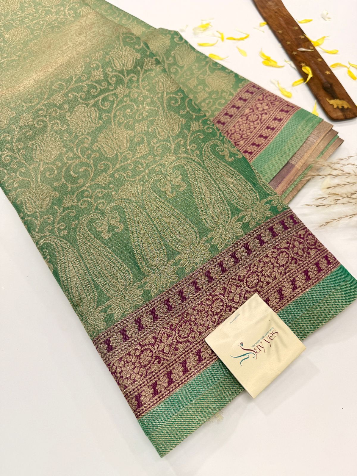 Grace takes form in this ethereal powder green Kancheevaram silk saree, intricately woven with delicate floral vines and grand paisley motifs in shimmering zari. The elegance of the body is perfectly complemented by a contrasting deep teal zari border, detailed with traditional motifs that add depth and richness to the drape.