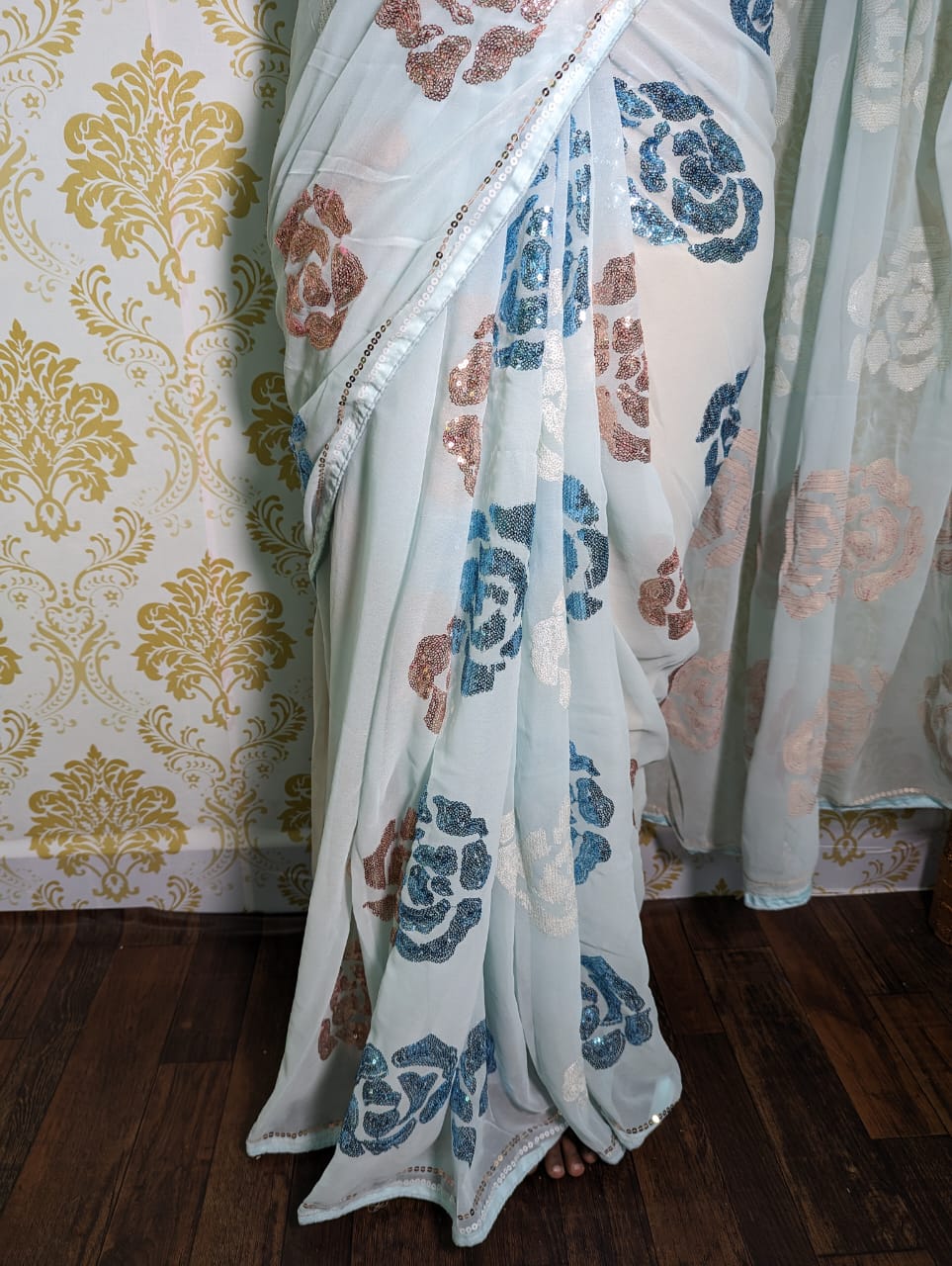 Sequinned Saree in georgette – Baby blue