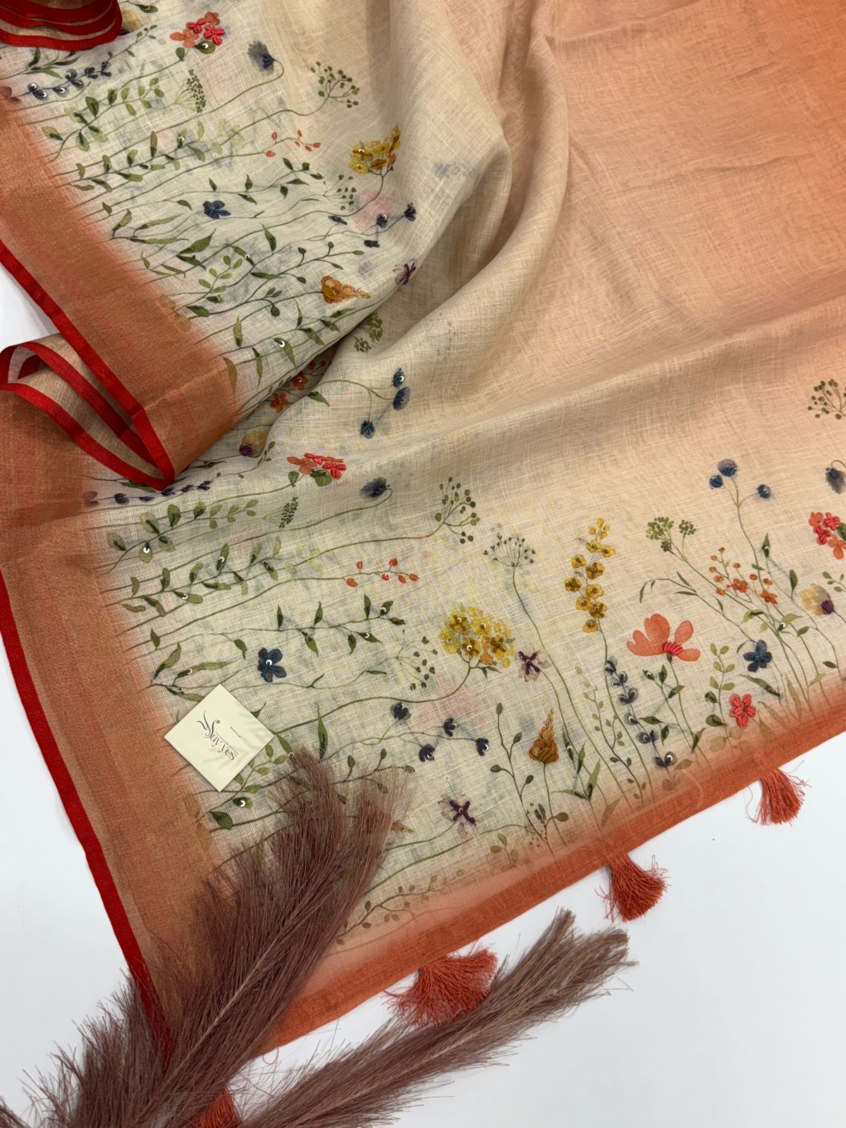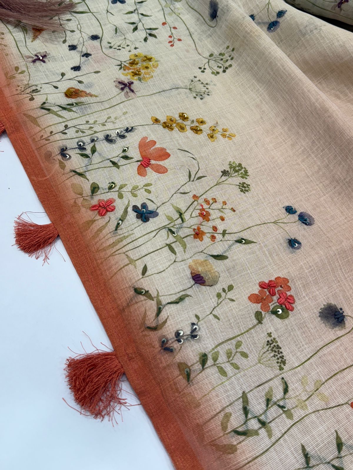 A dreamy blend of elegance and comfort — this pure linen saree comes alive with delicate hand-paint–style floral motifs that scatter gracefully across the body. The soft beige base paired with a warm ochre pallu creates a soothing, earthy palette that flatters every skin tone.