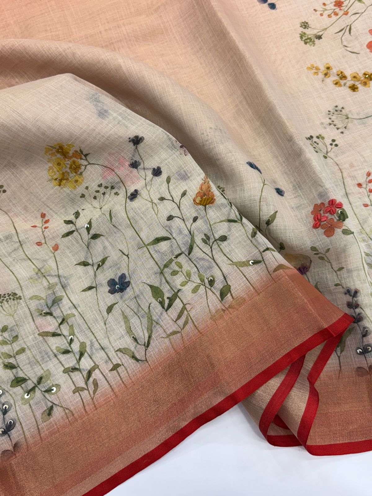 Finished with a striking red selvedge and tiny sequins that add a hint of sparkle, this saree is perfect for day events, festive lunches, and sophisticated casual wear. Light, airy, and effortlessly graceful — it’s beauty wrapped in comfort.