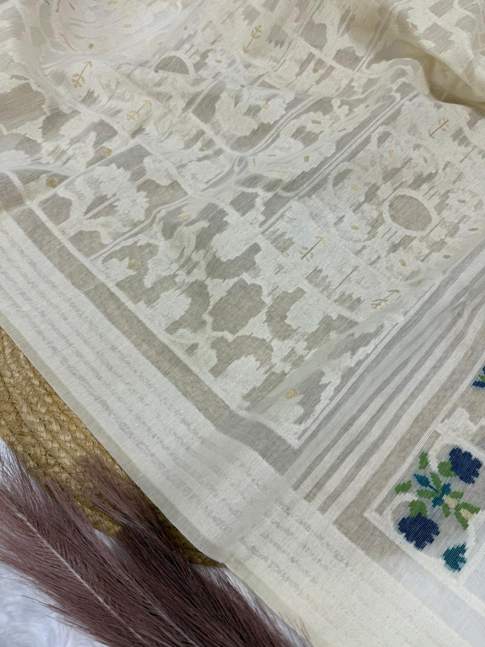 Elevate your ethnic charm with this Handwoven Jamdani organic mul cotton Saree, a delicate masterpiece blending tradition and elegance. The soft beige and muted rose pink base is adorned with intricate floral Jamdani motifs, reminiscent of Mughal-era artistry. The finely woven fabric offers a lightweight and airy drape, making it perfect for all-day wear. The saree is accentuated with bold red tassels at the pallu, adding a playful yet sophisticated touch.