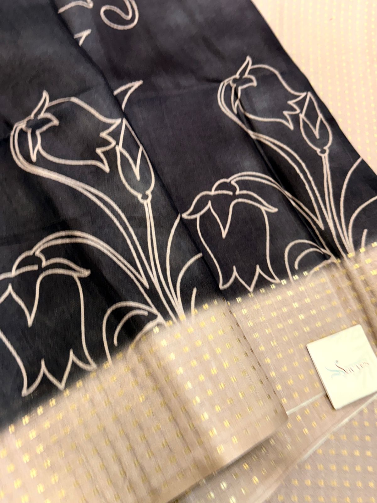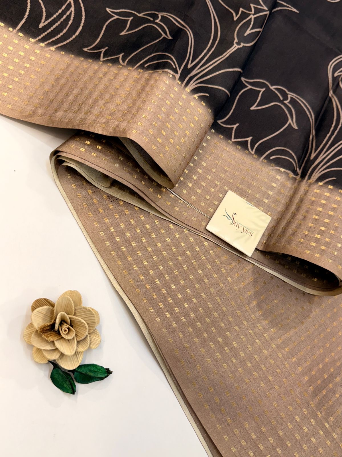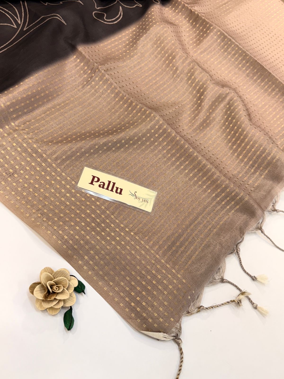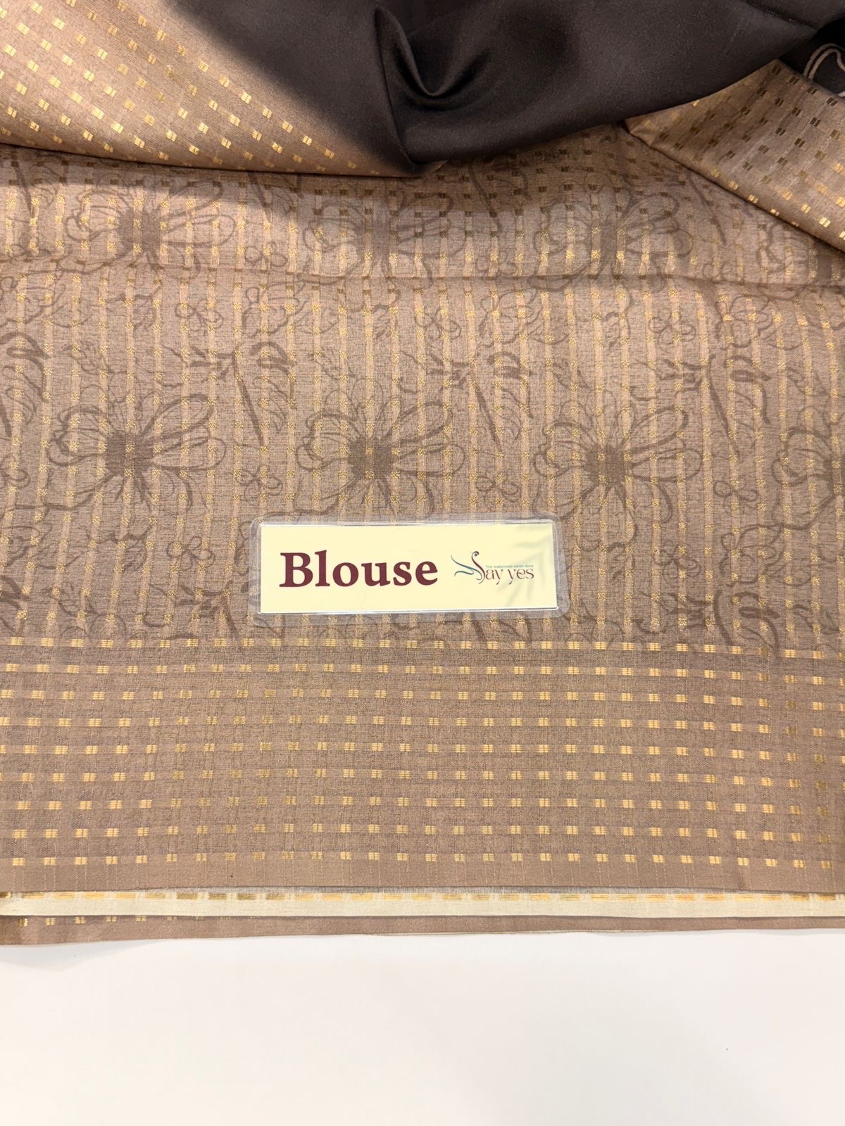 Pallu: Beige-gold pallu with densely woven zari stripes, finished with tasseled edges