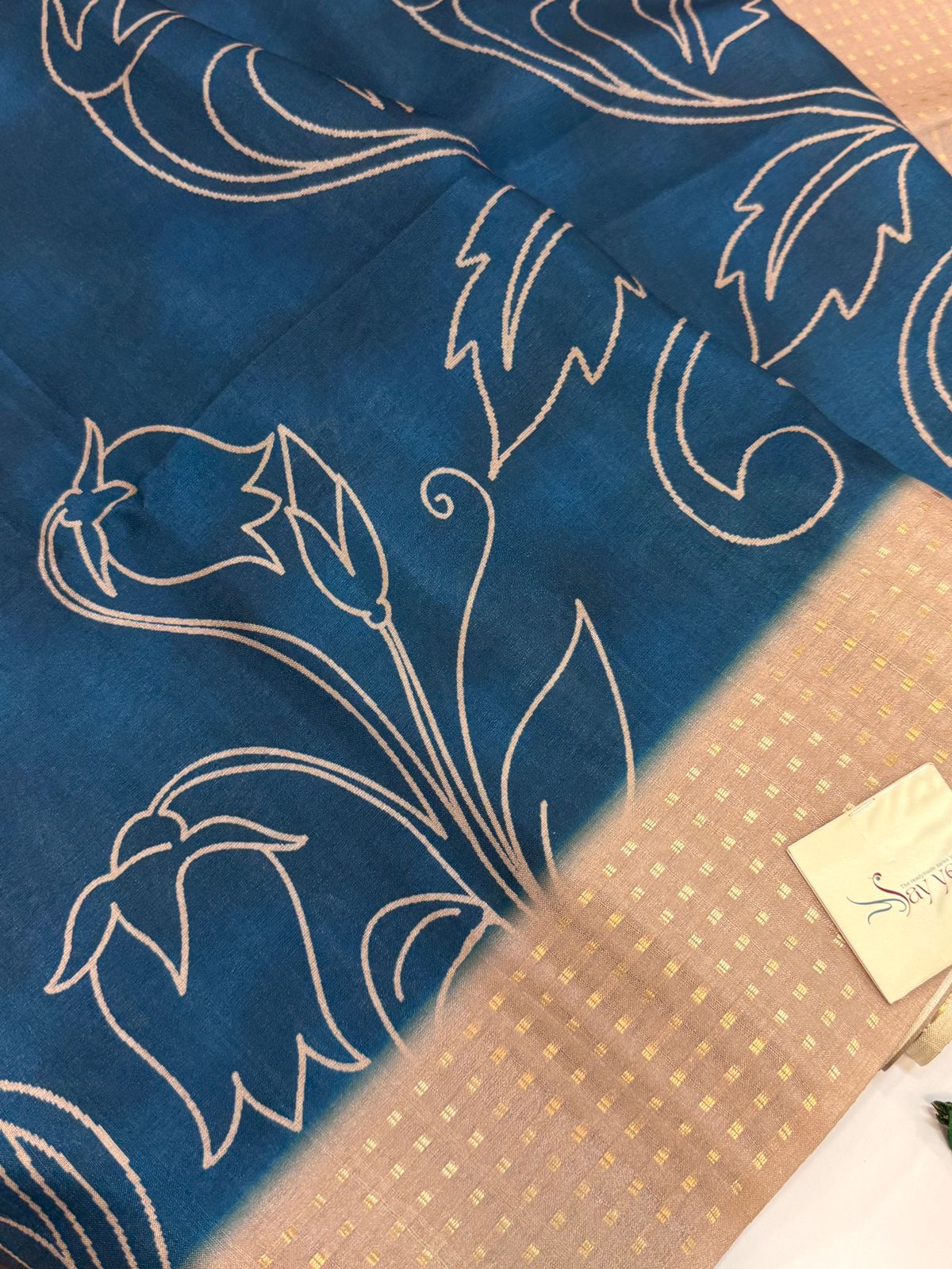 Border: Subtle beige-gold zari border with fine geometric checks