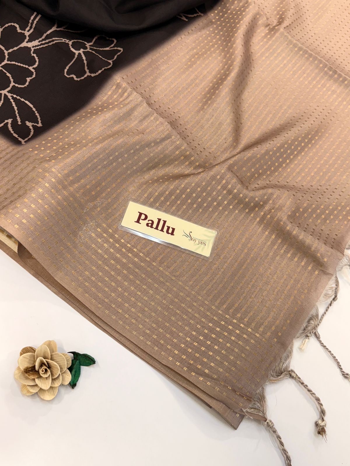 Pallu: Beige-gold pallu with densely woven zari stripes, finished with tasseled edges