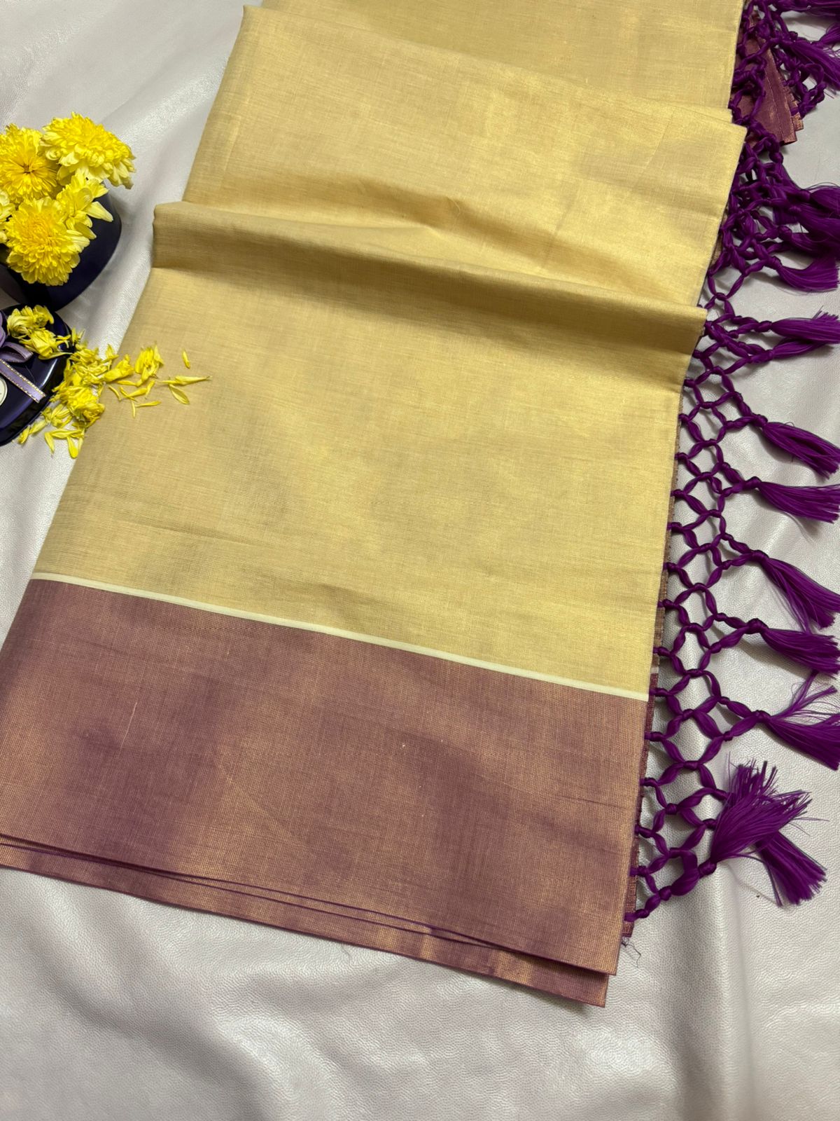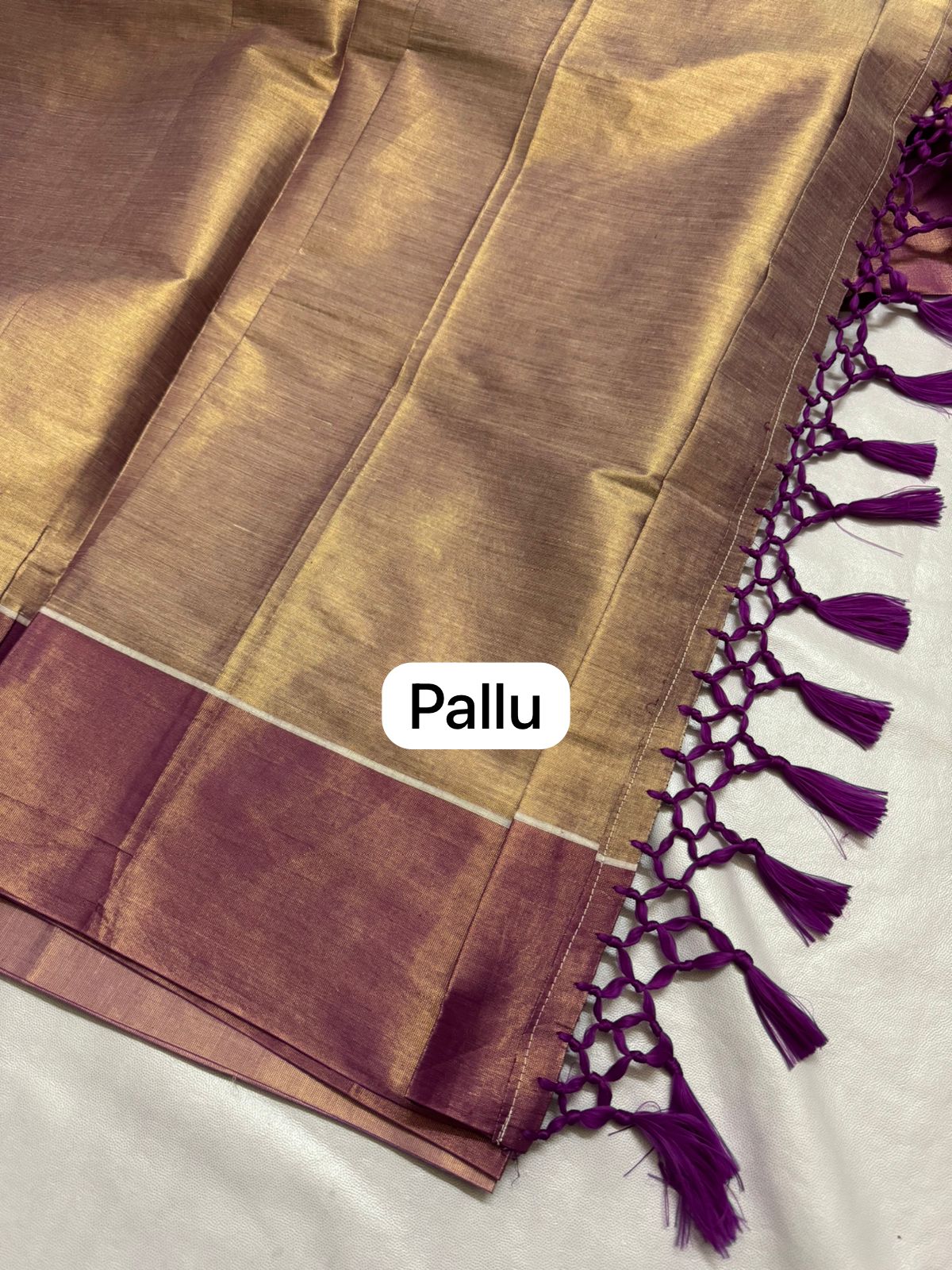 Our Soft Tissue silk sarees usher a minimalistic look with modern jari infused with saree thread with a lot of tassels on the pallu.