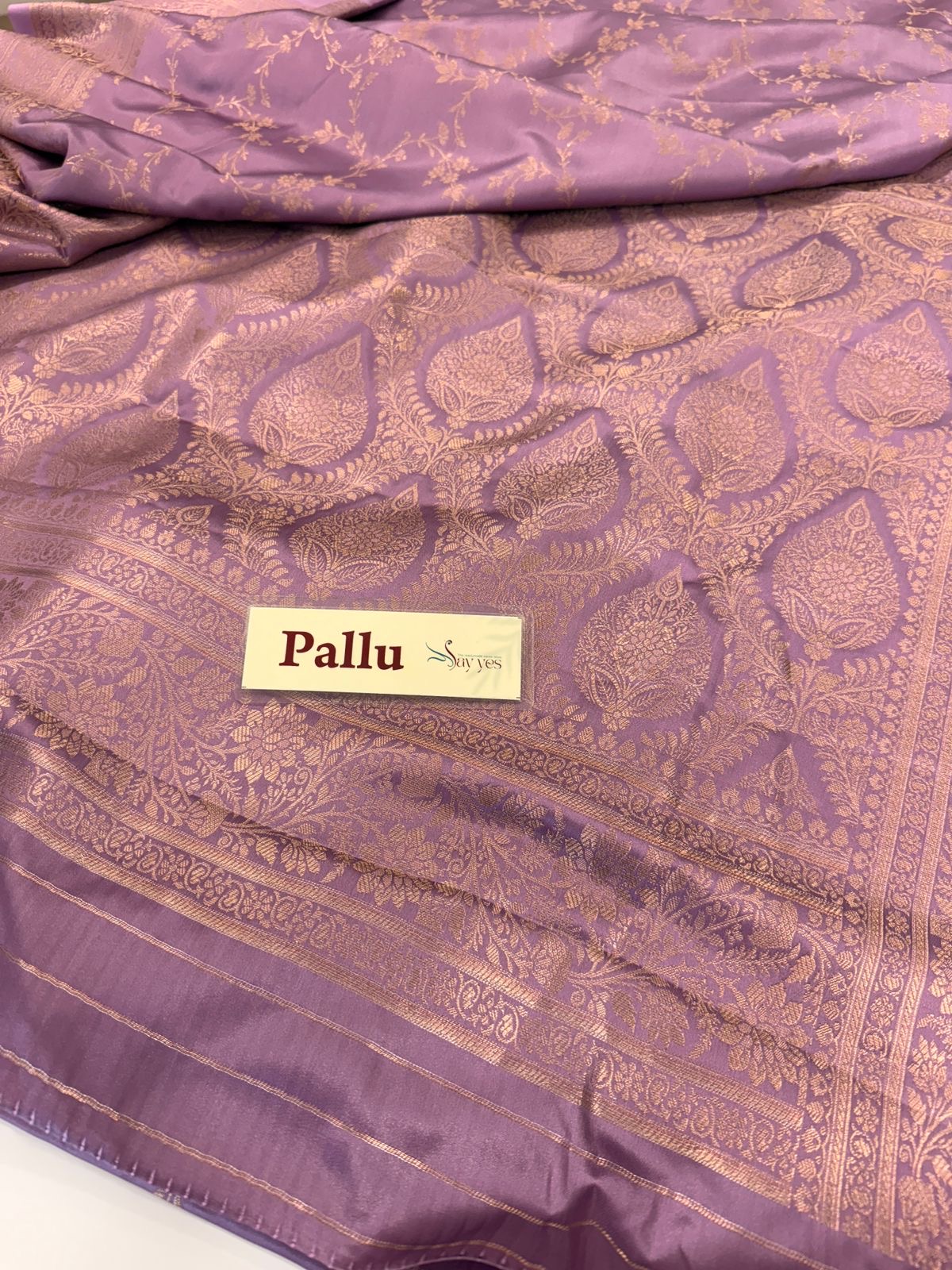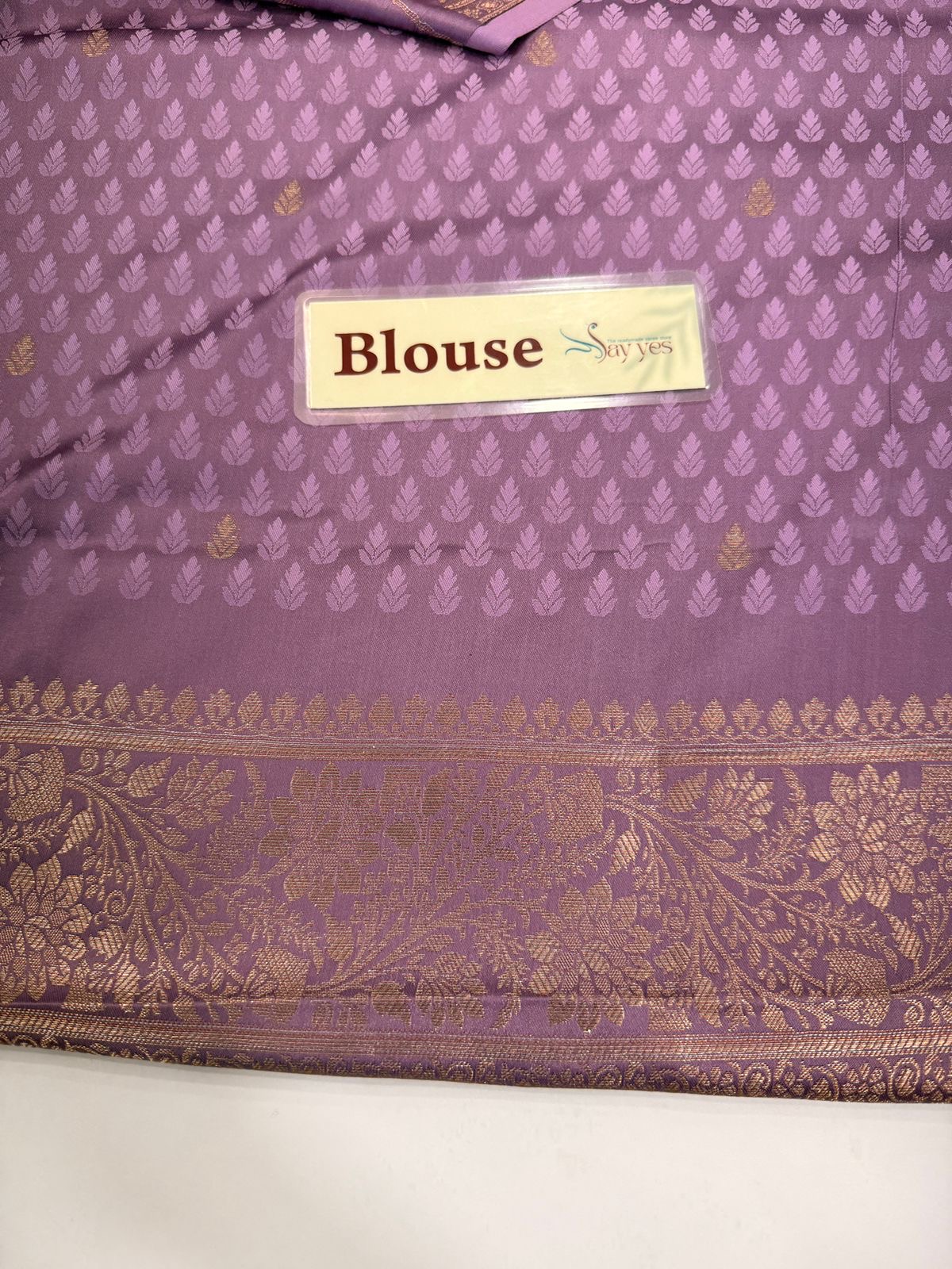 Drape yourself in timeless elegance with this handwoven semi Kanjivaram silk saree, featuring a pastel Lilac body adorned with intricate zari vines and floral motifs in soft antique gold. The rich pallu and borders are intricately woven with traditional patterns, showcasing paisleys and florals that reflect the grandeur of South Indian craftsmanship. The soft yet lustrous silk drapes gracefully, making it ideal for bridal and festive wear.