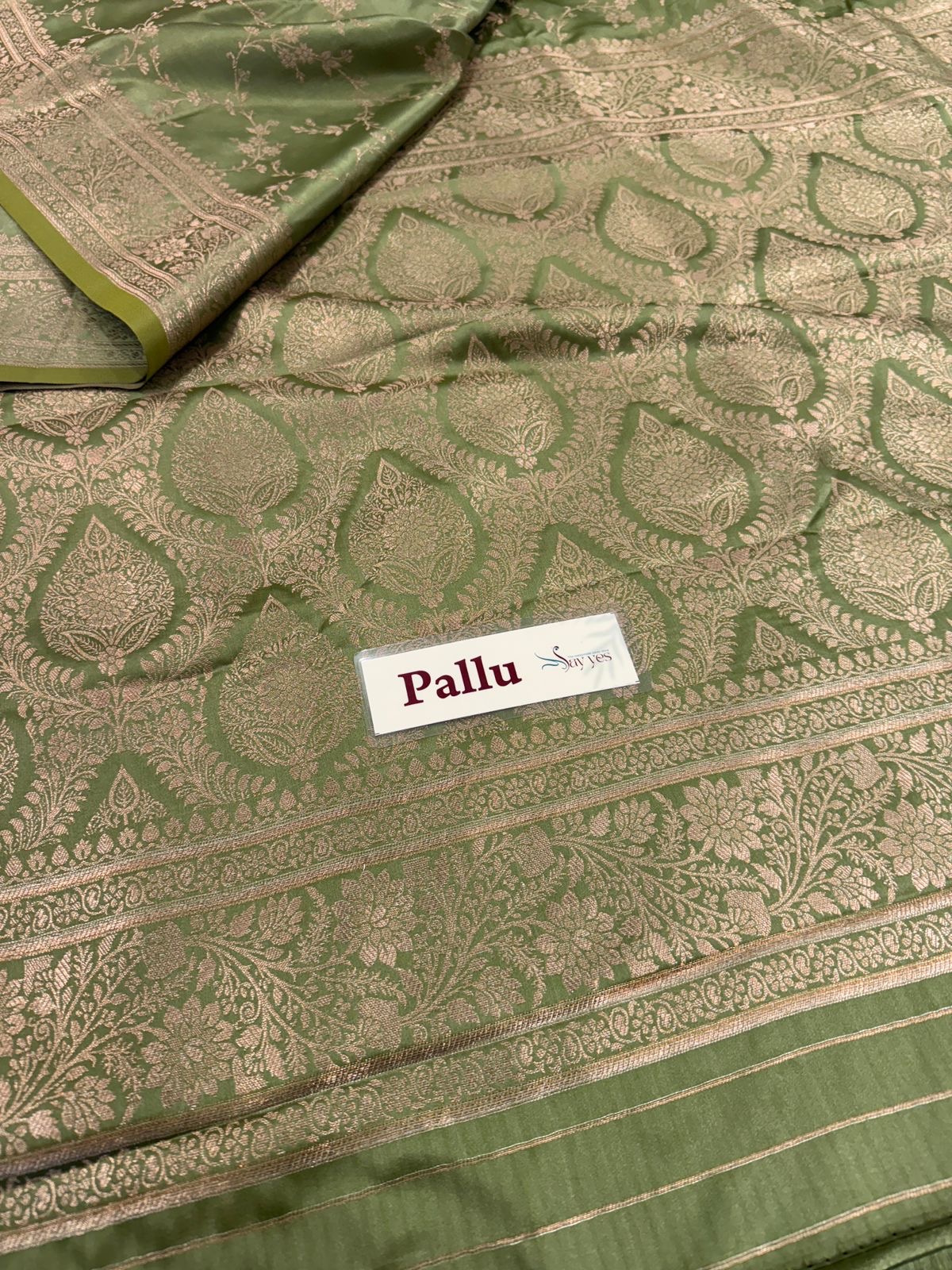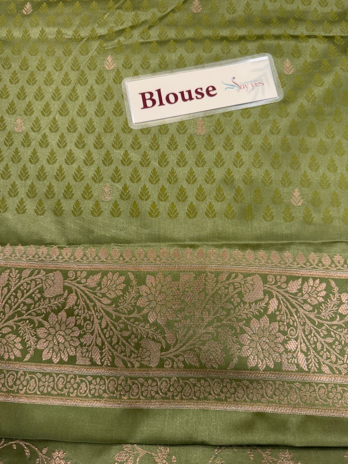 Drape yourself in timeless elegance with this handwoven semi Kanjivaram silk saree, featuring a parrot green body adorned with intricate zari vines and floral motifs in soft antique gold. The rich pallu and borders are intricately woven with traditional patterns, showcasing paisleys and florals that reflect the grandeur of South Indian craftsmanship. The soft yet lustrous silk drapes gracefully, making it ideal for bridal and festive wear.
