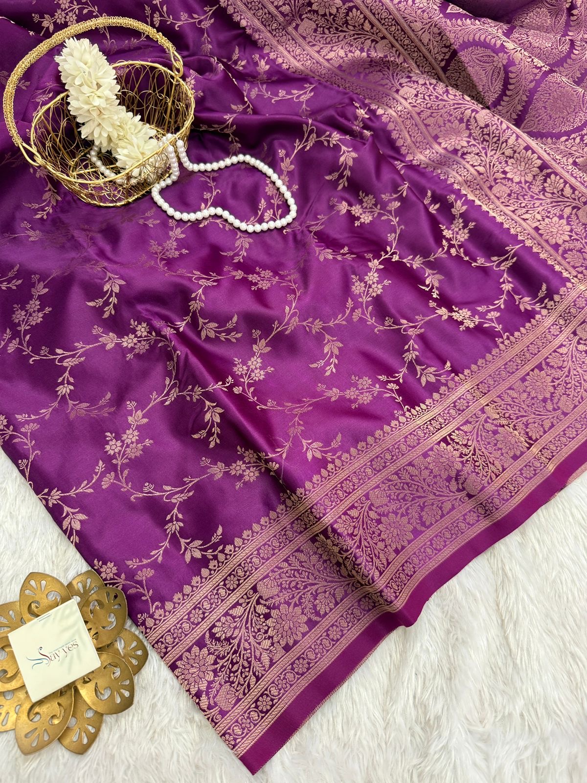 Drape yourself in timeless elegance with this handwoven semi Kanjivaram silk saree, featuring a deep amethyst-purple body adorned with intricate zari vines and floral motifs in soft antique gold. The rich pallu and borders are intricately woven with traditional patterns, showcasing paisleys and florals that reflect the grandeur of South Indian craftsmanship. The soft yet lustrous silk drapes gracefully, making it ideal for bridal and festive wear.