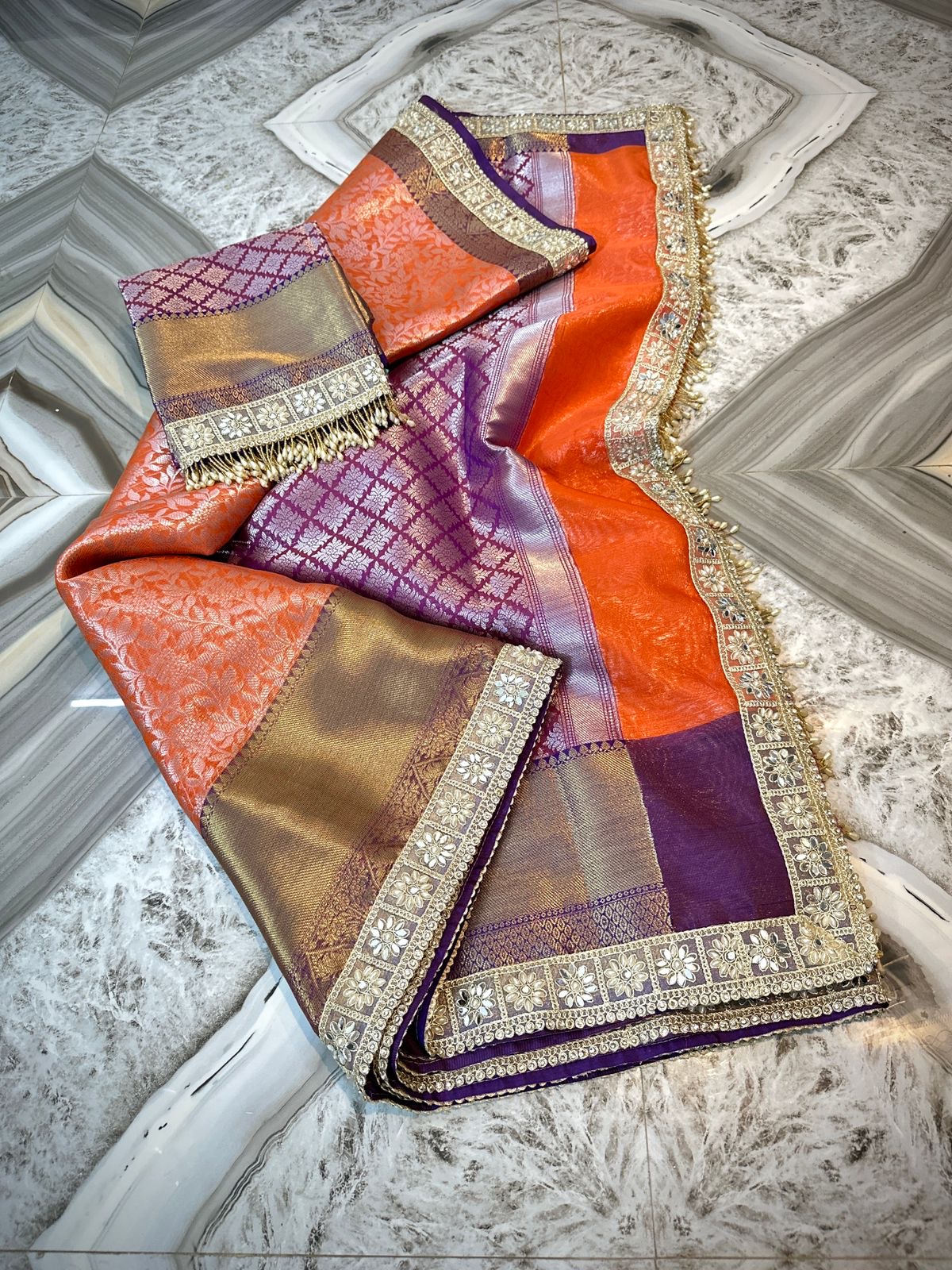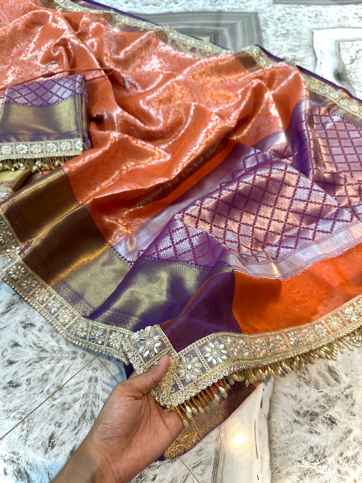 This exquisite Banarasi Kancheevaram bridal saree blends the grandeur of Kancheevaram silk with the intricate artistry of Banarasi weaving. Designed for the modern bride who dreams of tradition with a twist, this saree is a celebration of luxury — on a smart budget.