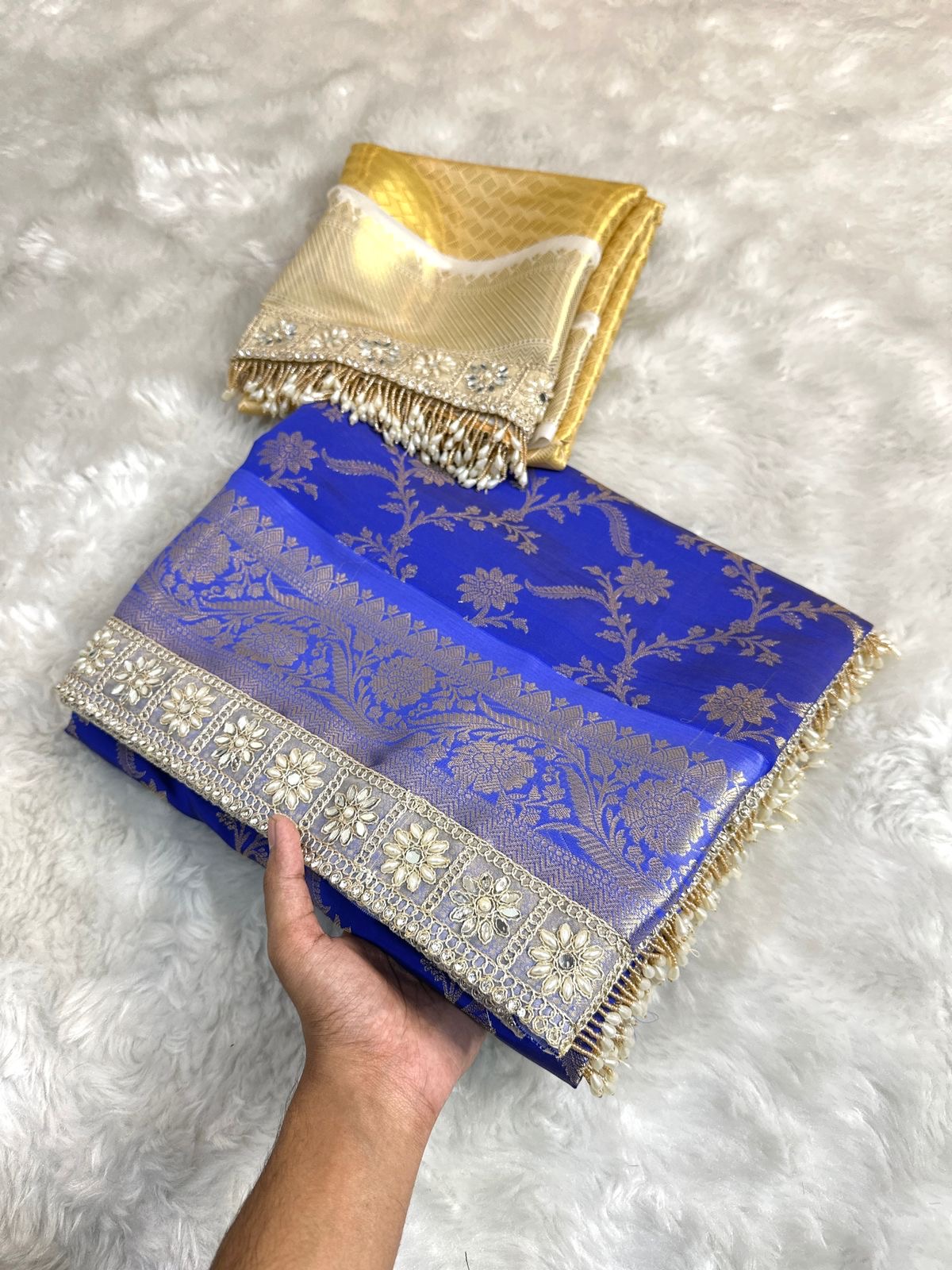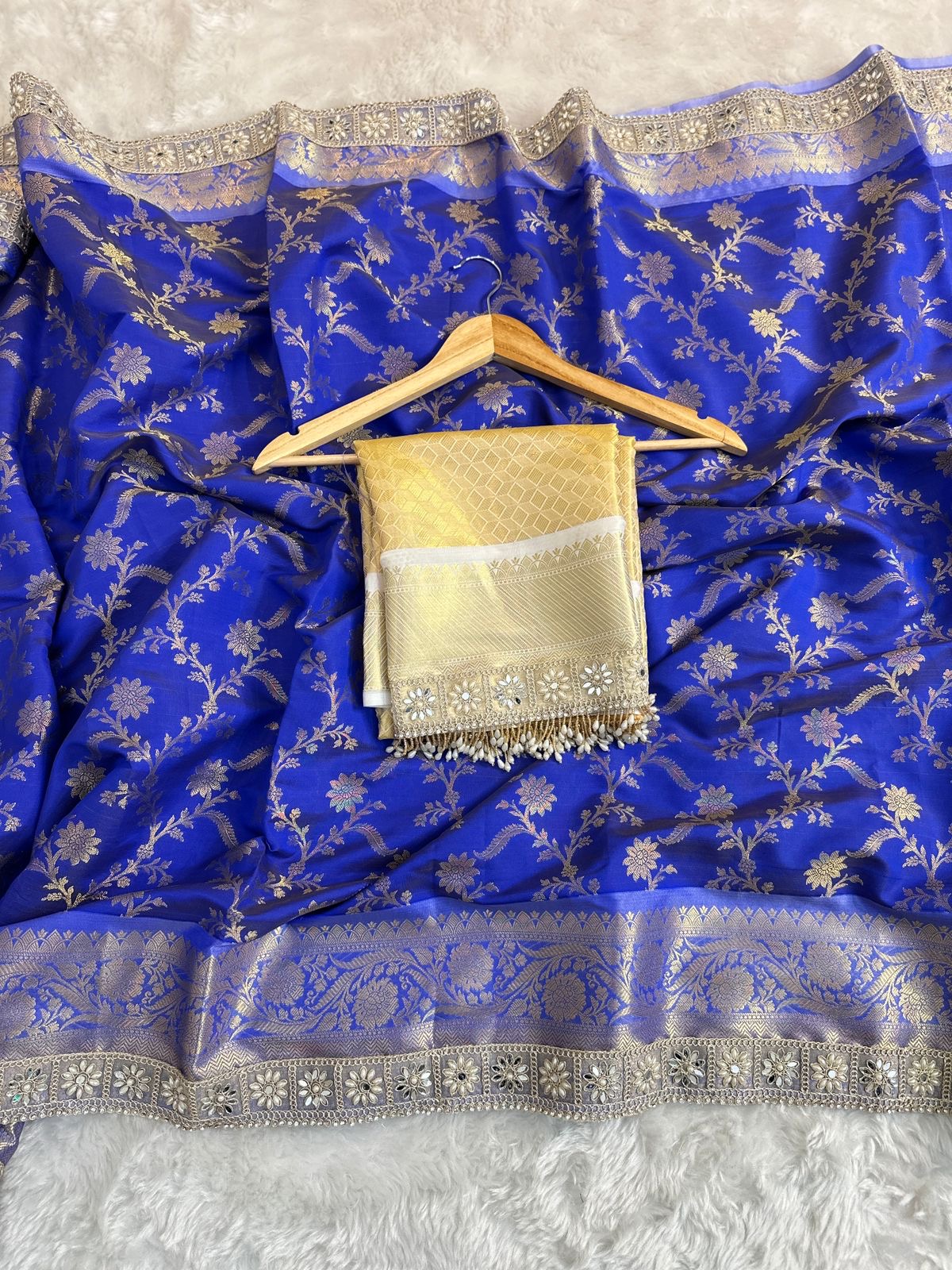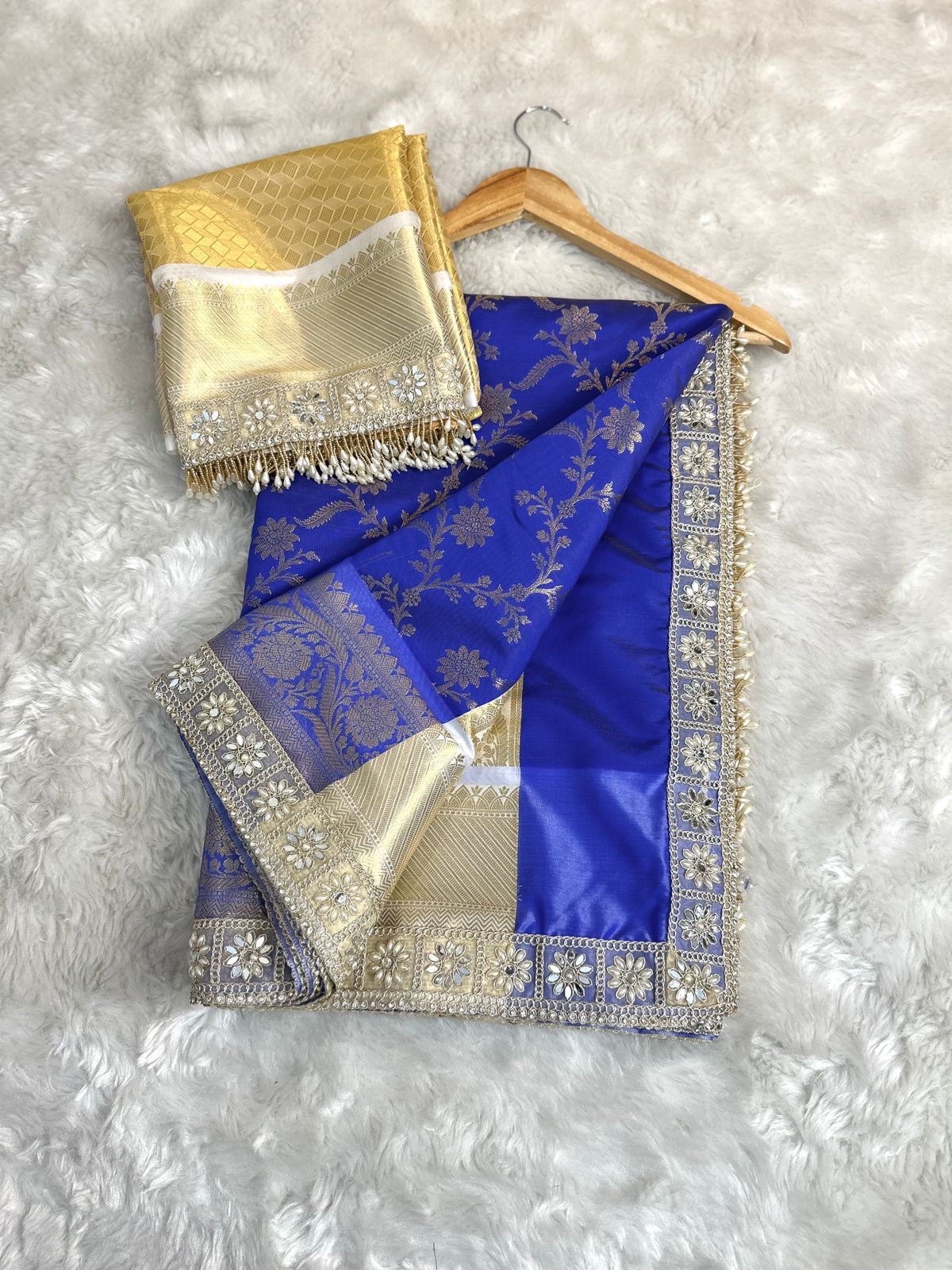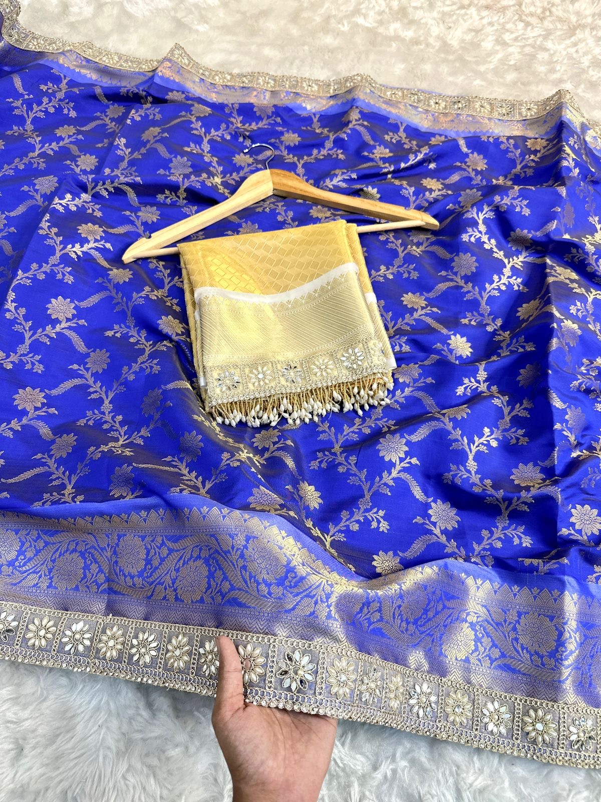 - Weave: Intricately woven gold zari motifs inspired by Mughal gardens and temple architecture