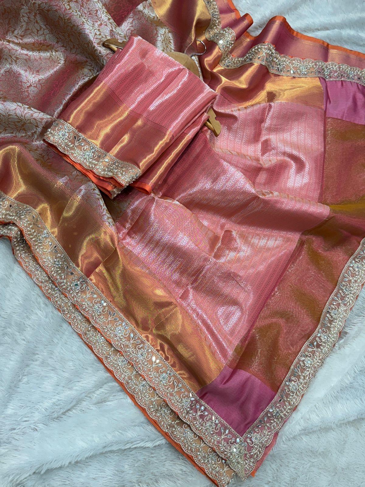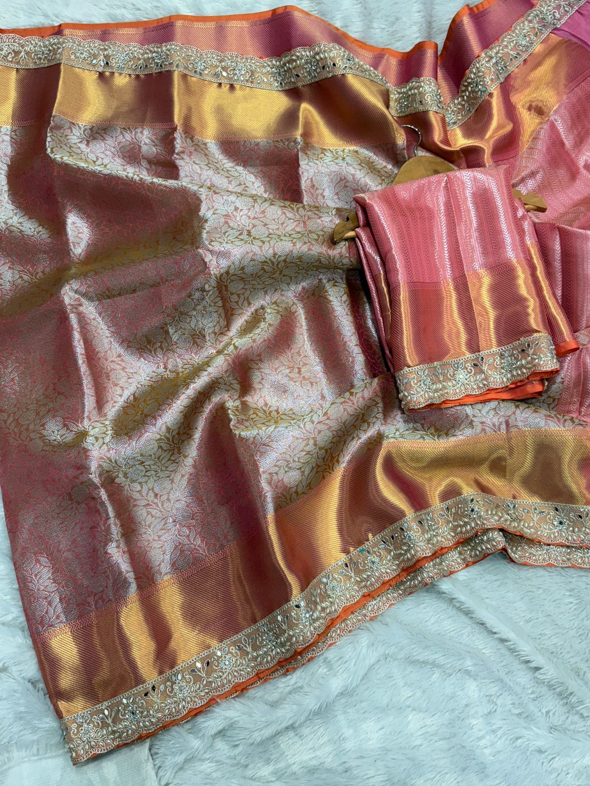 This exquisite Banarasi Kancheevaram bridal saree blends the grandeur of Kancheevaram silk with the intricate artistry of Banarasi weaving. Designed for the modern bride who dreams of tradition with a twist, this saree is a celebration of luxury — on a smart budget.