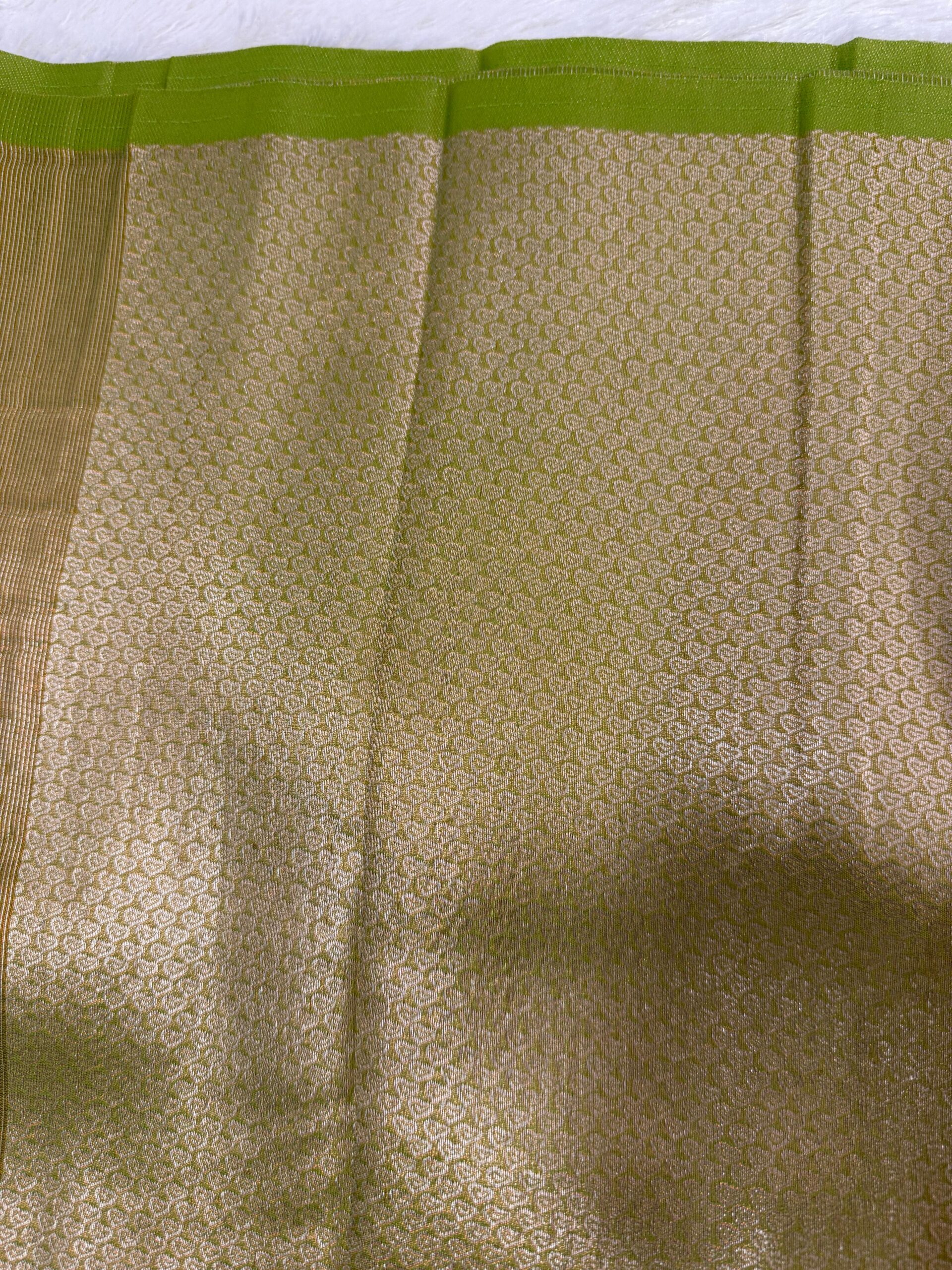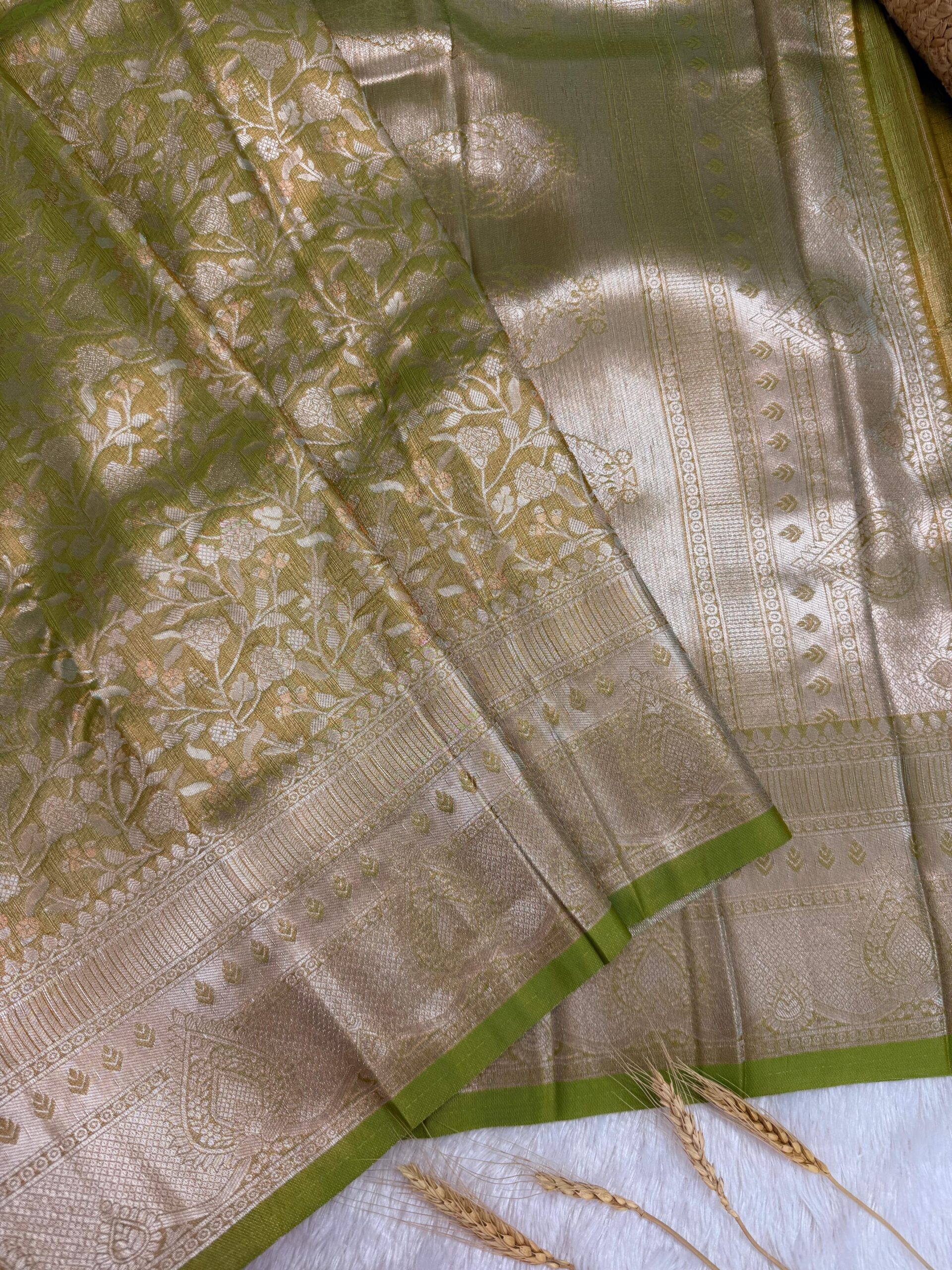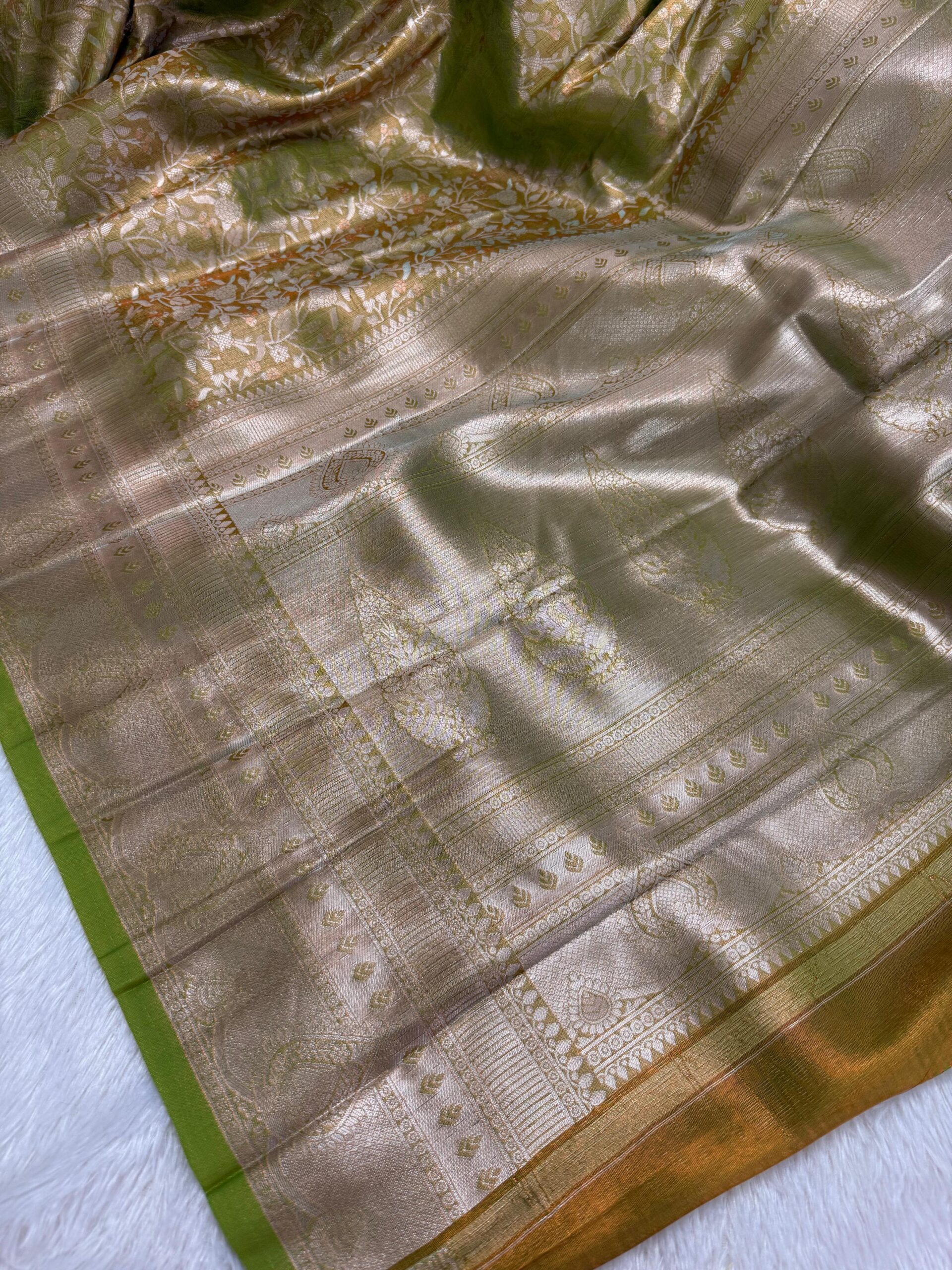 This saree is a beautifully woven piece in a radiant fusion of lush olive green with shimmering gold, exuding elegance and grace. The fabric is Banarasi brocade silk, featuring a delicate floral jaal (all-over vine and flower) pattern that adds elegance and sophistication. The border and pallu are adorned with detailed paisley and geometric motifs, enhancing its traditional appeal.