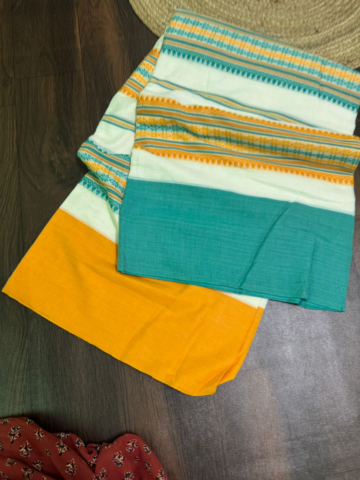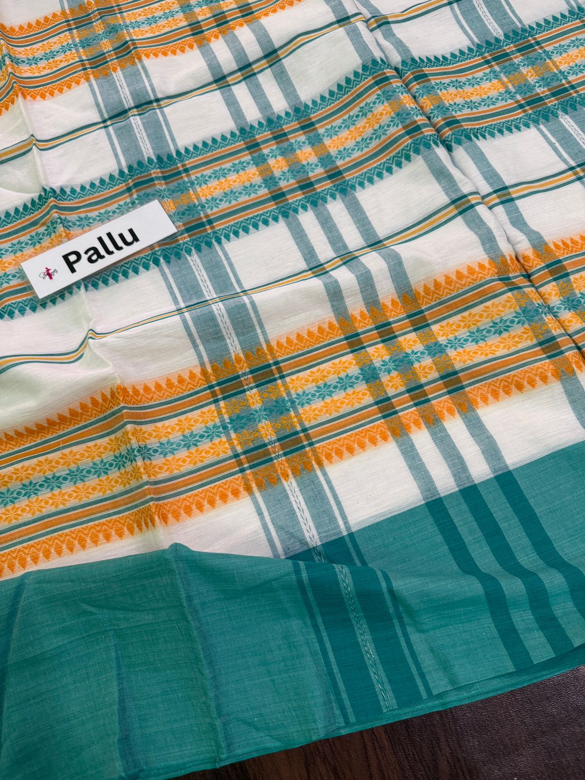 This is an organic Mul cotton saree with a refreshing combination of white, teal, and mustard hues. The body of the saree is predominantly white, adorned with intricate horizontal stripes featuring delicate thread embroidered floral and geometric patterns in orange and teal. The saree is accentuated by a teal border, giving it a classic yet modern touch. Mul cotton is known for its softness and breathable texture, making this saree a comfortable and stylish choice for casual or semi-formal occasions.