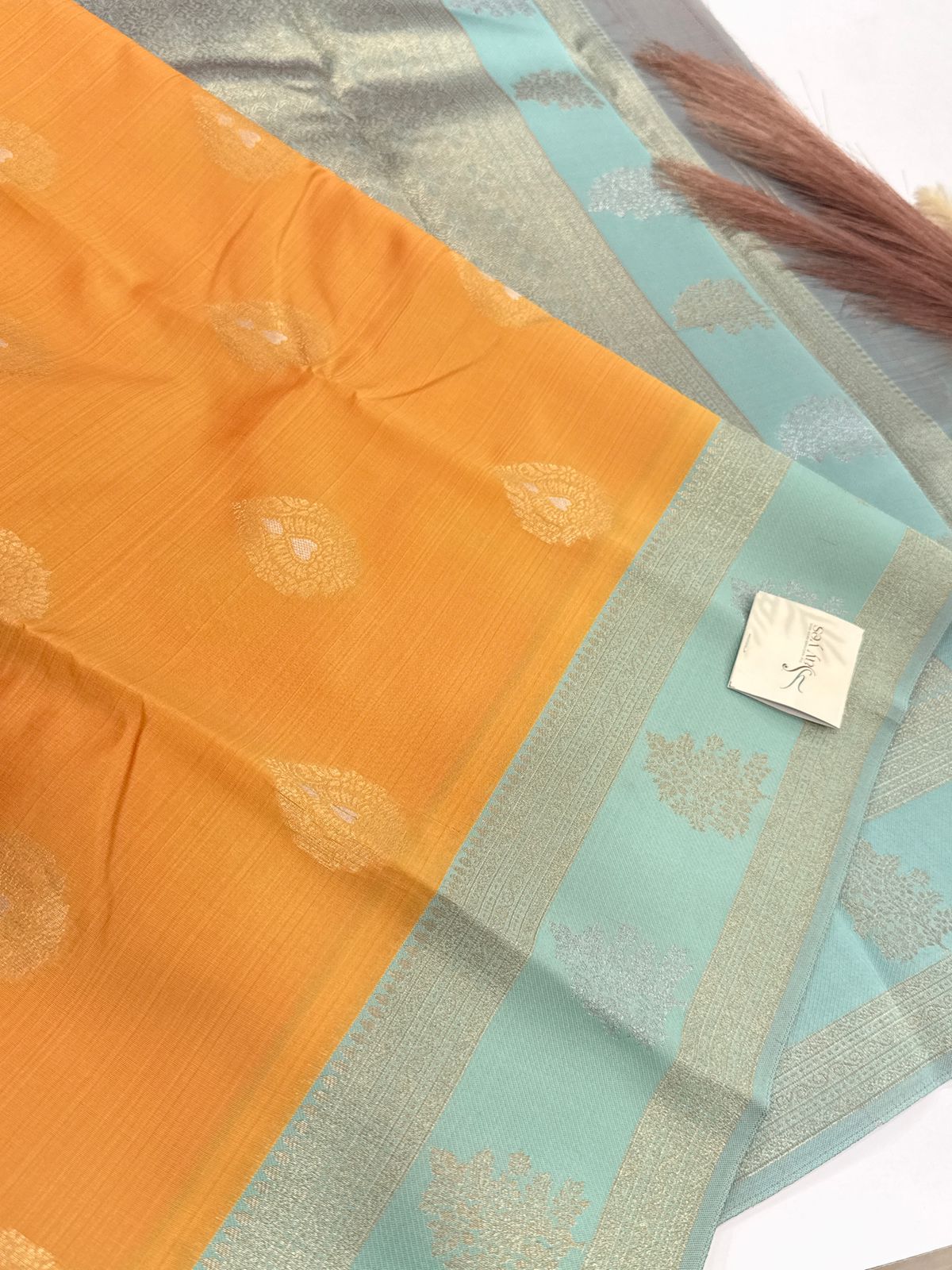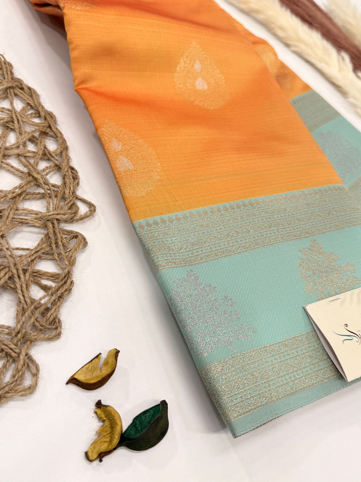 This elegant saree features a rich tangerine-colored body adorned with intricately woven golden zari motifs, adding a touch of traditional grandeur. The motifs are delicately spaced, giving the saree a refined and regal appearance. Complementing the deep tone of the body is a beautifully contrasting ice-blue border, intricately embellished with gold zari work in floral and traditional patterns. The pallu continues this design language with a generous display of golden weaving, enhancing the overall richness of the drape. Crafted from a lustrous silk-blend fabric, this saree is perfect for festive occasions, weddings, and cultural celebrations, offering a graceful blend of tradition and sophistication.