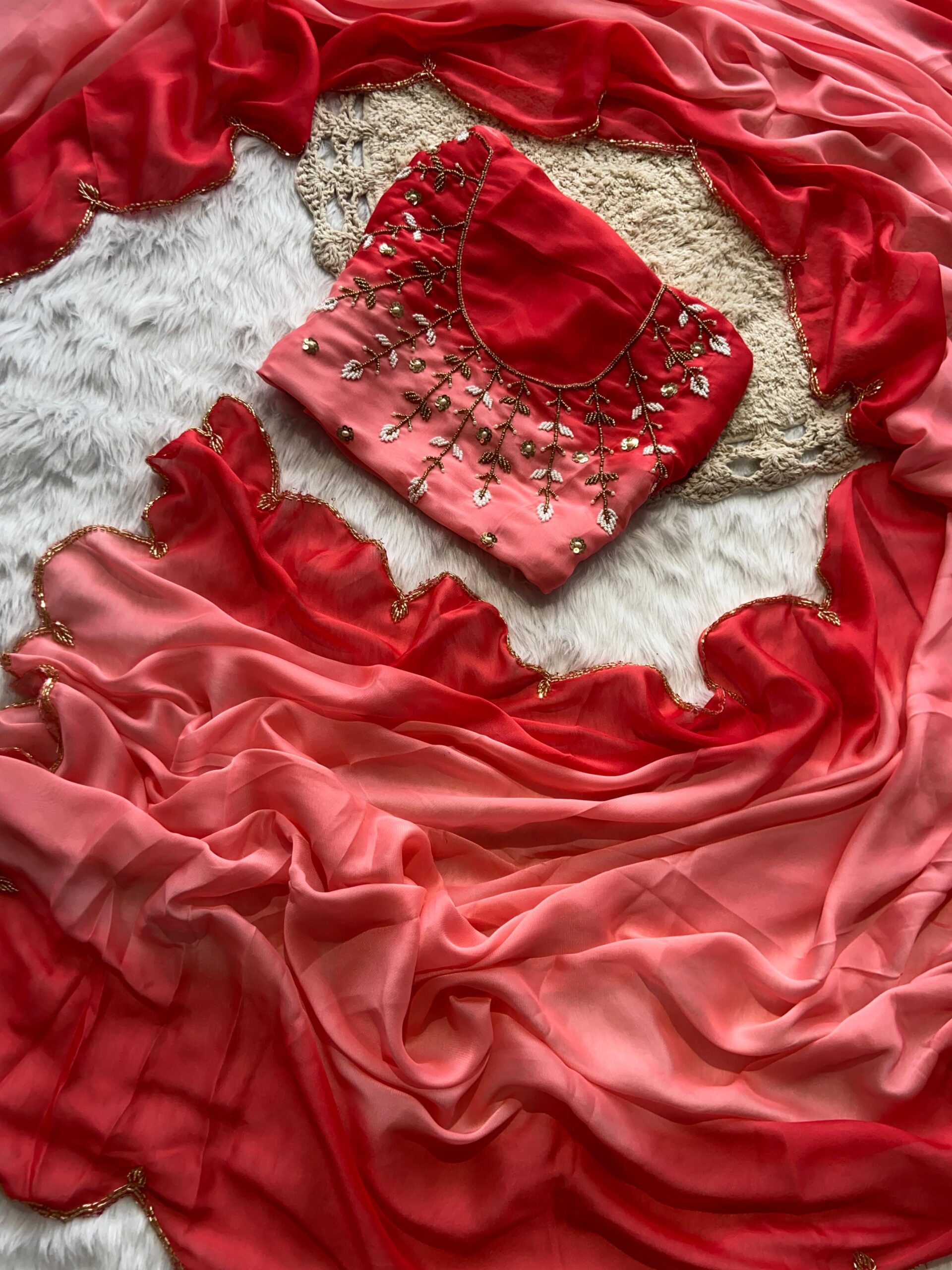 Embrace the beauty of flowing elegance with this ombre chiffon georgette saree. The saree transitions seamlessly from soft peach to a deep, rich red, creating a striking visual appeal. Delicate golden beadwork along the scalloped edges adds a touch of sparkle, perfect for festive and celebratory occasions. The saree is paired with a stunning red and peach ombre blouse, intricately embellished with leaf and vine embroidery in gold and white threads, elevating the overall look. Lightweight and easy to drape, this saree ensures both comfort and style for any special event.