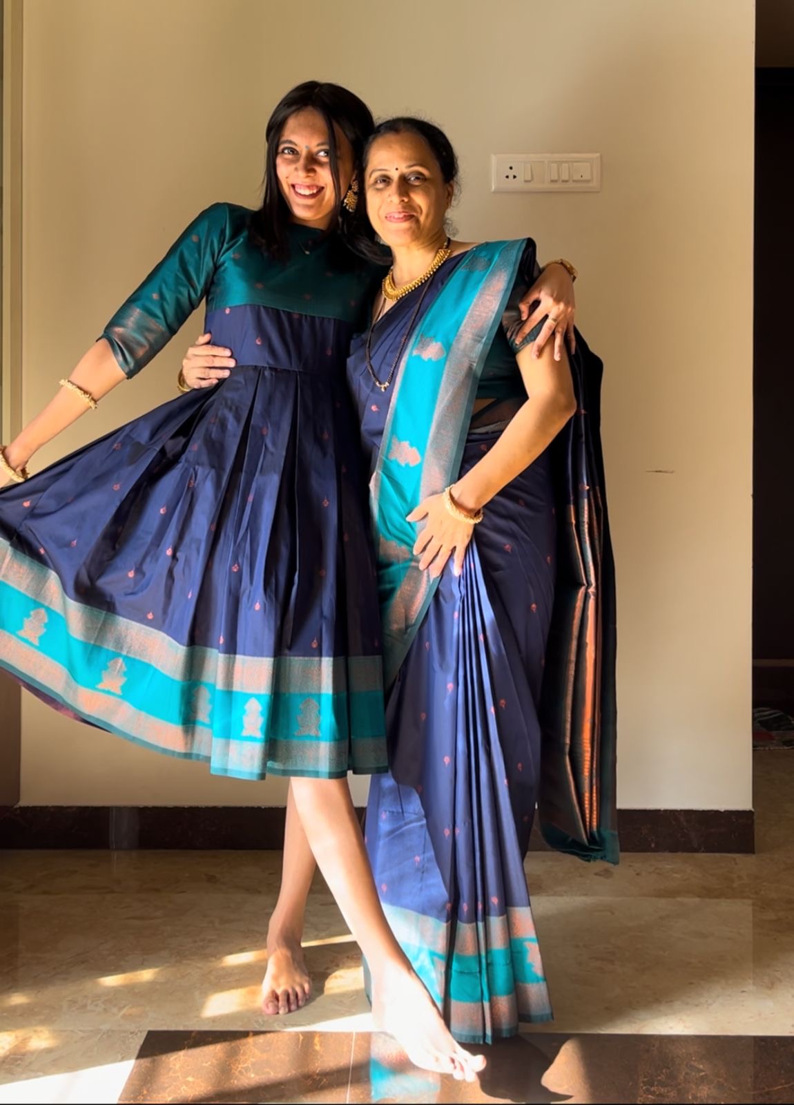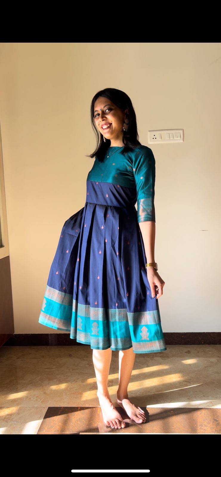This elegant and traditional Anarkali-style dress is crafted from rich silk fabric, featuring a deep navy-blue body with intricate floral motifs subtly embroidered across the skirt and bodice. The upper bodice and sleeves are highlighted in a contrasting teal green that adds a refreshing pop of color. A broad border of teal with golden accents and intricate weaving at the hemline complements the overall look, giving the outfit a perfect balance between simplicity and grandeur. Ideal for festive occasions, celebrations, or cultural events, this dress offers both comfort and style.