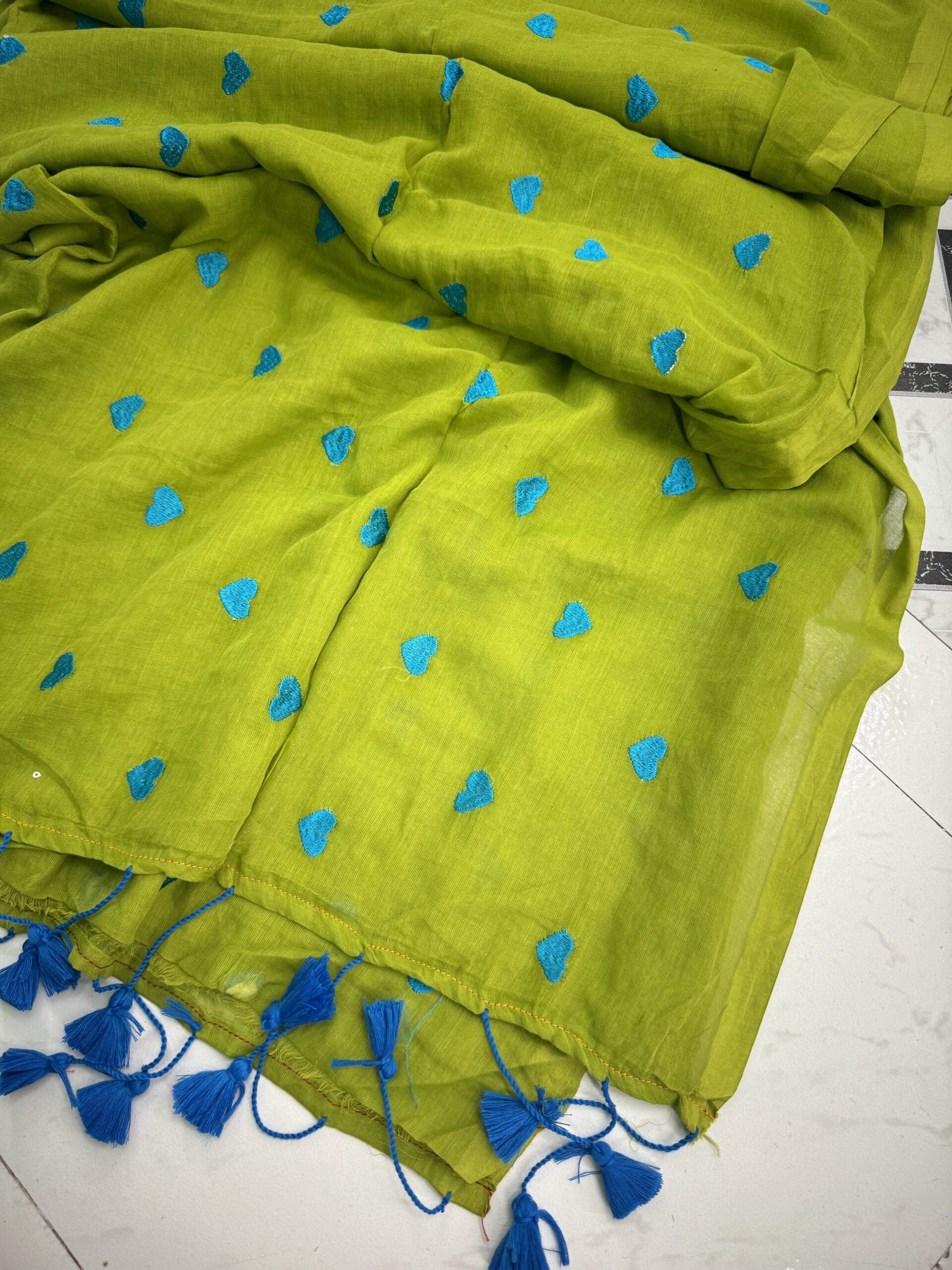Experience elegance and comfort of our Queen of Hearts saree. Crafted from soft Mul cotton, this saree is perfect for a breezy, lightweight feel, ideal for warm weather. The saree is  Adorned with charming heart motifs, adding a touch of playful femininity. The saree is finished with a whimsical fringe of tassels, making it both stylish and comfortable for any occasion. Whether you’re dressing up for a casual day out or an intimate gathering, this saree ensures you stand out with grace and ease.