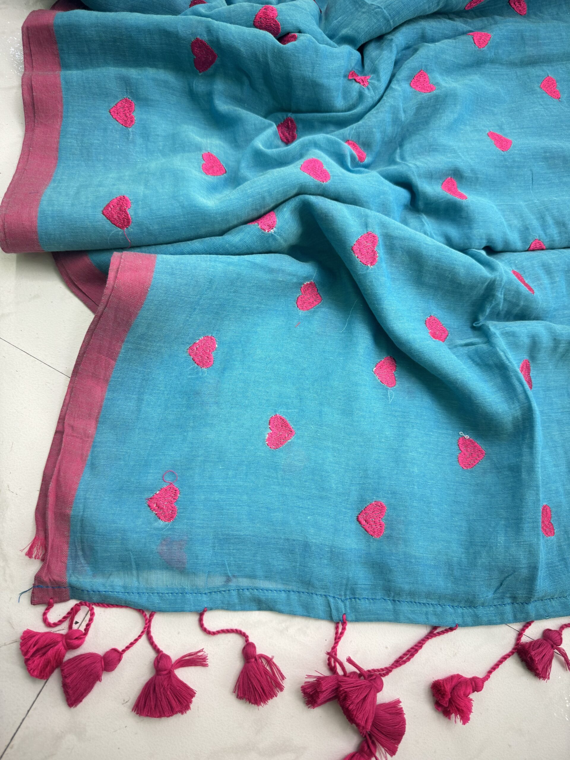 Experience elegance and comfort of our Queen of Hearts saree. Crafted from soft Mul cotton, this saree is perfect for a breezy, lightweight feel, ideal for warm weather. The saree is Adorned with charming heart motifs, adding a touch of playful femininity. The saree is finished with a whimsical fringe of tassels, making it both stylish and comfortable for any occasion. Whether you’re dressing up for a casual day out or an intimate gathering, this saree ensures you stand out with grace and ease.