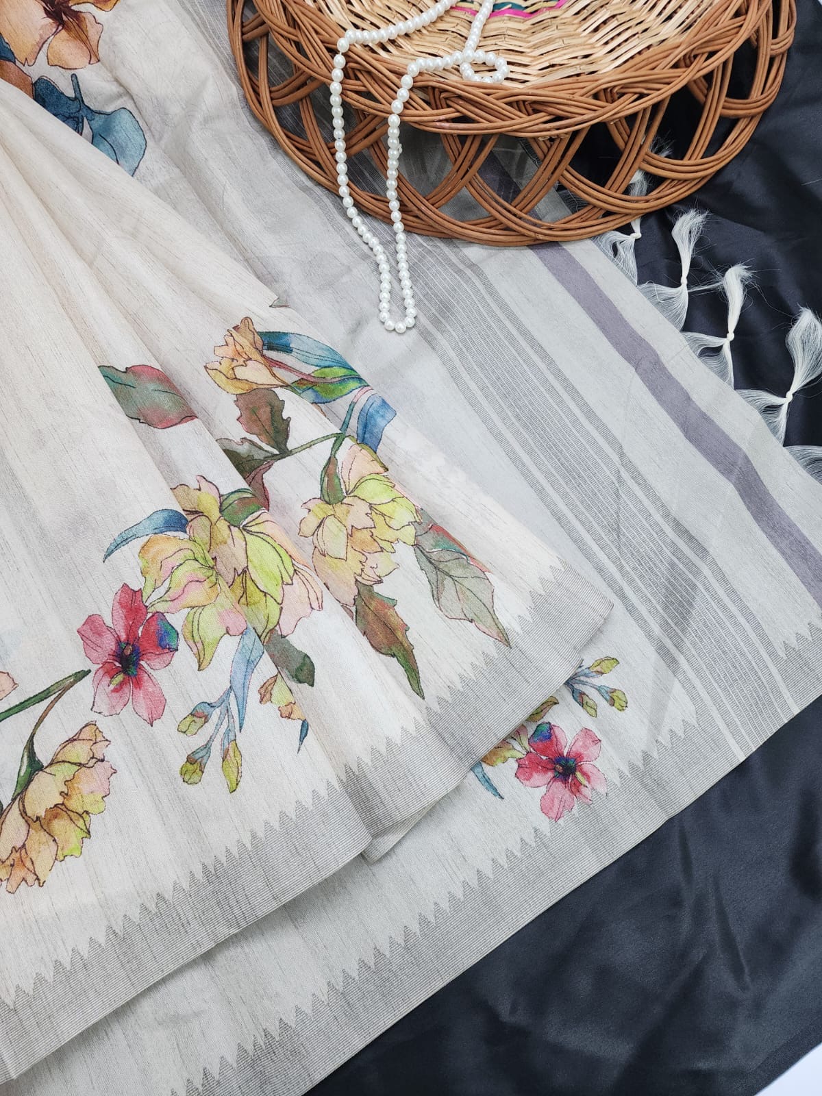 Perfect for daytime gatherings or evening celebrations, this saree promises both comfort and style, with a smooth, luxurious feel that drapes effortlessly. Let each fold whisper grace and beauty, making you feel as enchanting as the blooms that adorn it.