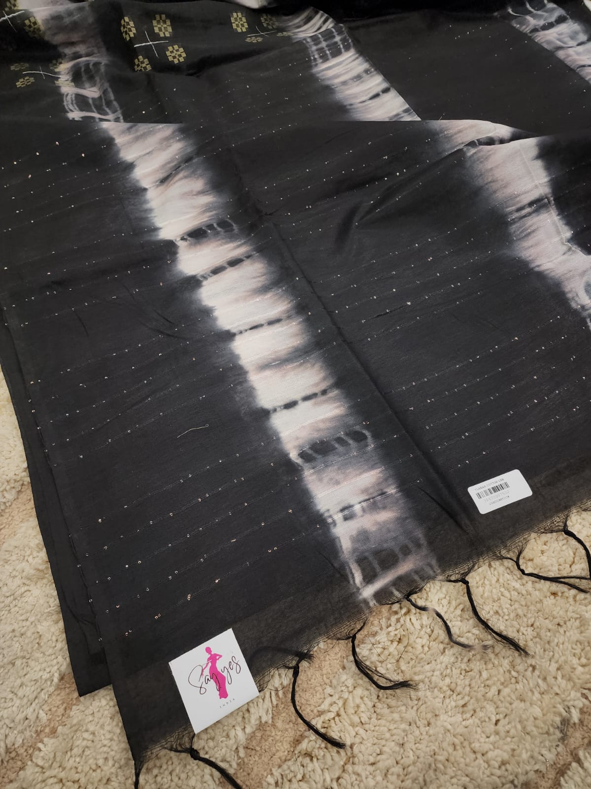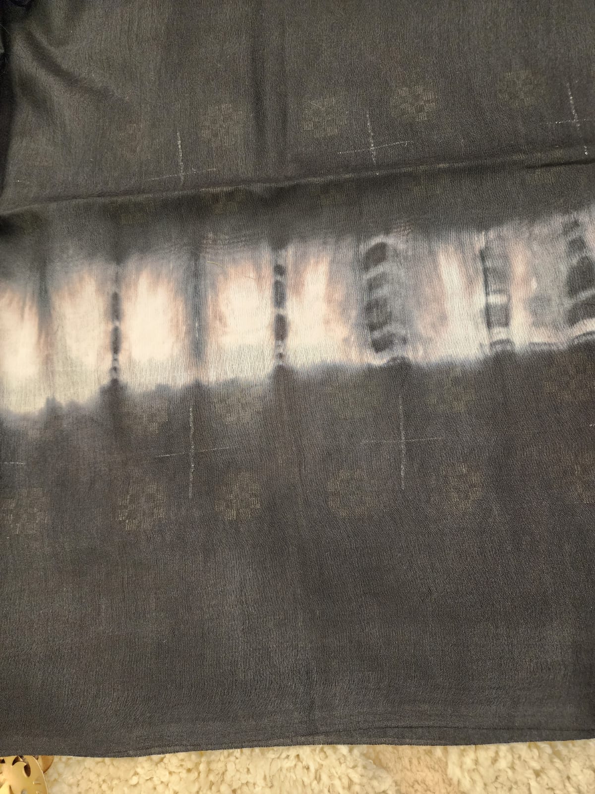 - Work: Handwoven with Ikat-Inspired Design and Gold Stripes