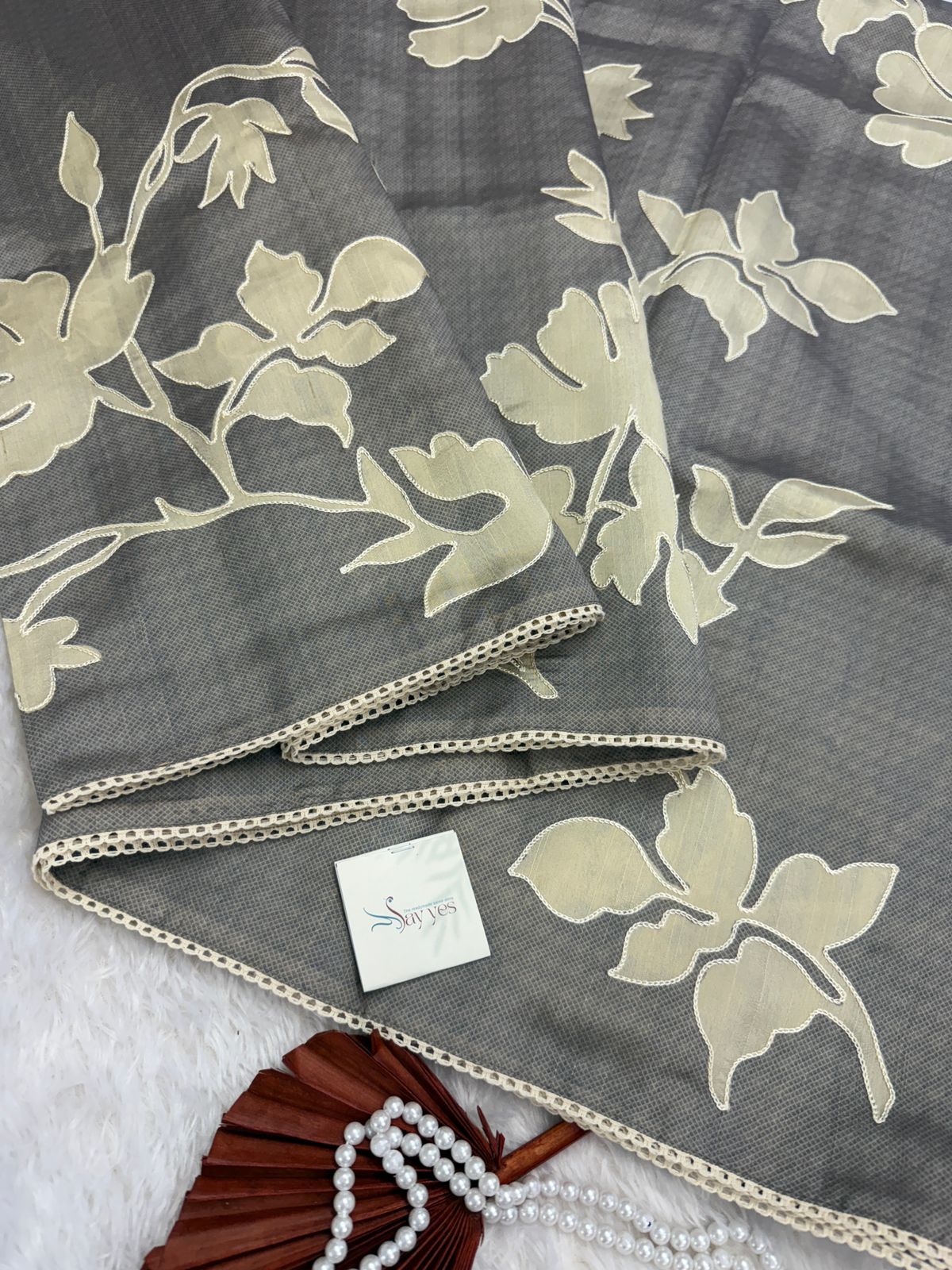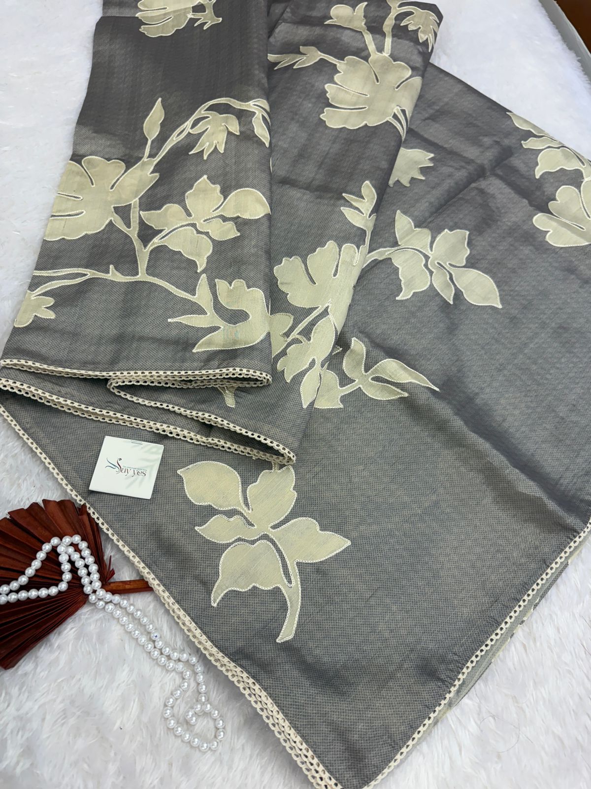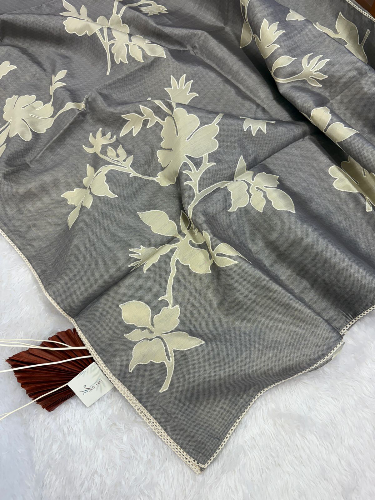 Vaarahi is a soft symphony in grey — a Tussar silk drape that whispers elegance. The muted green body forms a calm, earthy canvas while hand-appliquéd ivory blooms gently unfold across it like vintage poetry. Trimmed with delicate crochet lace, this saree balances heritage with quiet luxury — a graceful nod to the power of softness. Whether worn at dawn ceremonies or dusky soirées, Vaarahi is where tradition meets poetic minimalism.