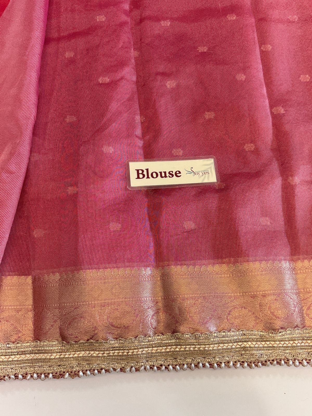An exquisite blend of tradition and luxury, this Banarasi Tissue Silk saree comes alive in a deep royal maroon, paired with shimmering champagne-gold zari weaving. The lightweight tissue body drapes like liquid gold, while the intricate floral and geometric motifs add a classic Banarasi grandeur.
