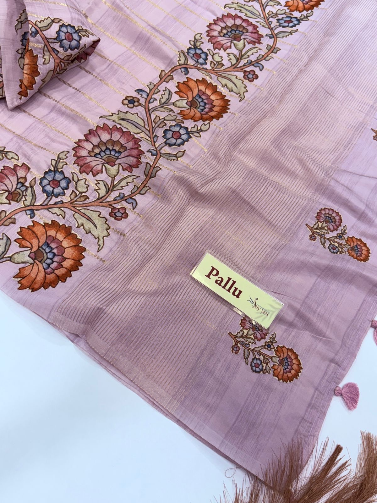 The pallu is beautifully detailed with intricate floral vines, giving the saree a graceful old-world charm. Lightweight, breathable, and effortlessly drapey, this piece blends traditional artistry with modern comfort, making it perfect for intimate functions, office festivities, and elegant evening wear.