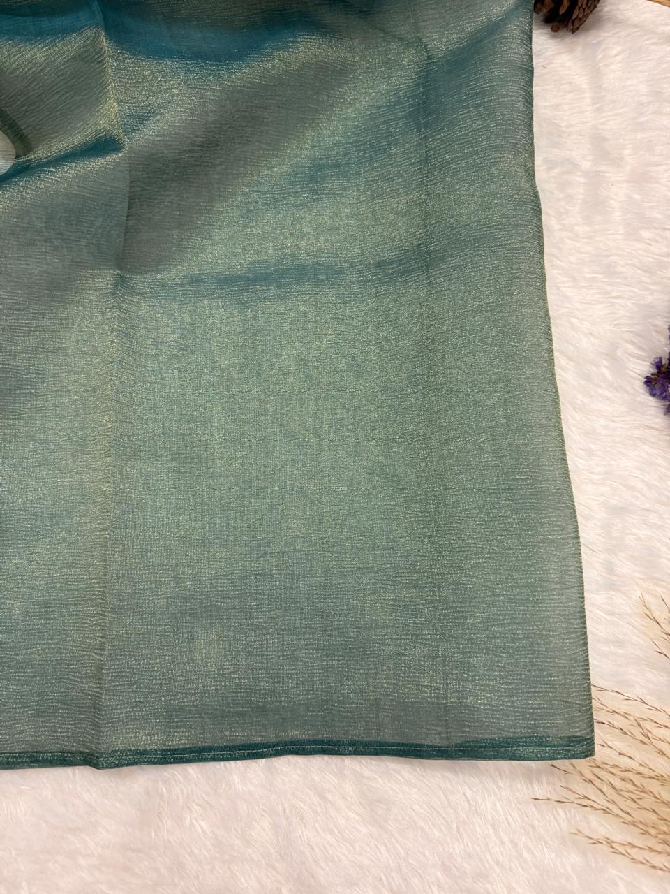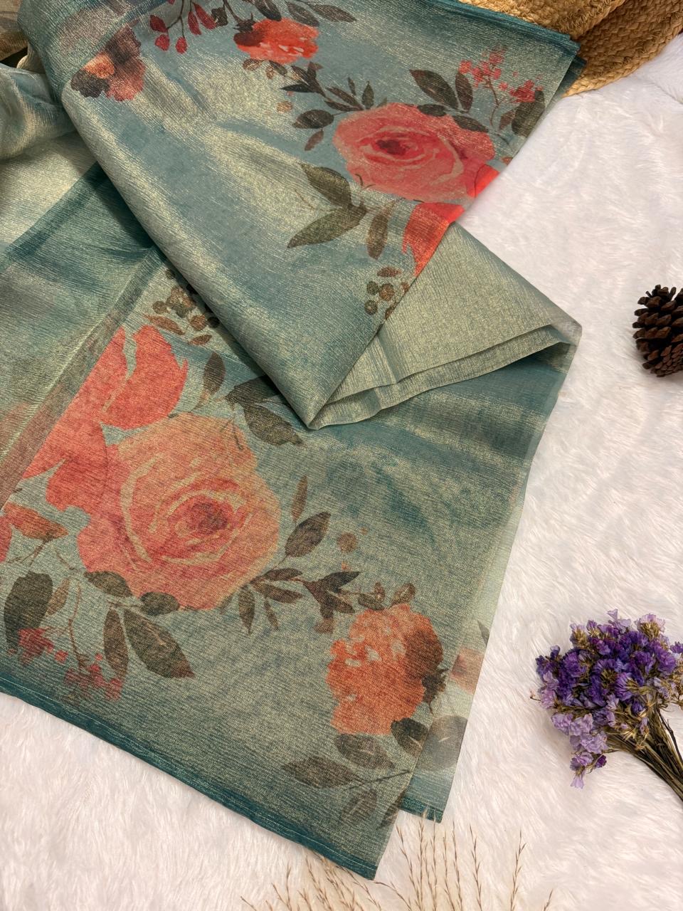 Float into elegance with our crushed digital printed tissue silk saree, a gentle blend of dreamy softness and understated shimmer. The delicate floral prints, in watercolor tones of Indigo, coral, and sage, bloom like poetry across the fabric, while the dandelion motifs add a touch of whimsy. Ultra-light, fluid, and breathable — this piece feels like a warm breeze on a spring morning.