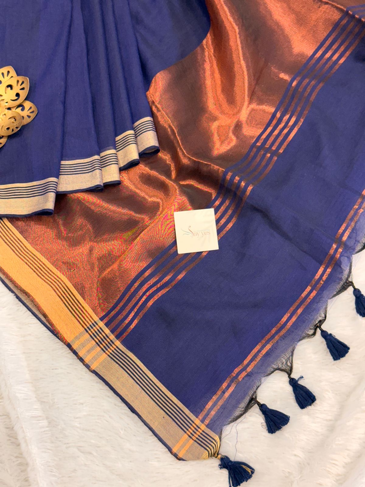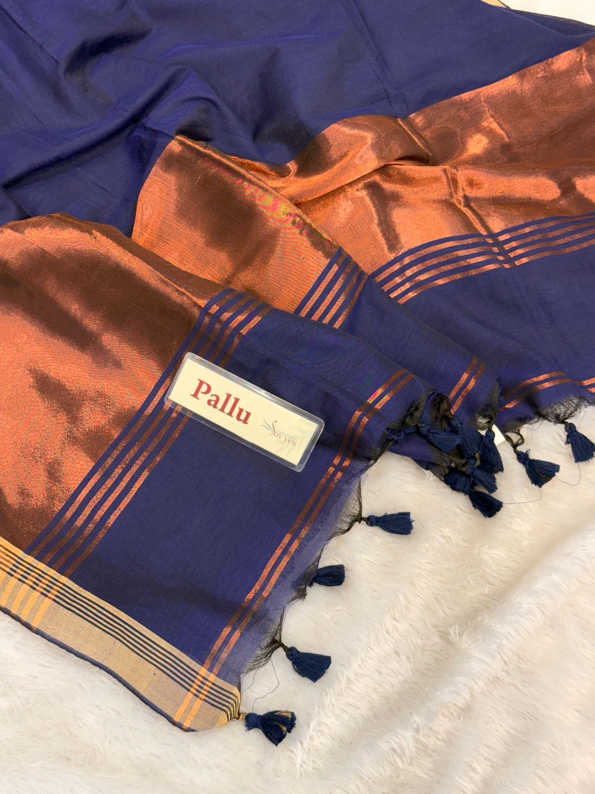 Crafted in airy mul cotton, this beauty comes alive in a deep indigo blue paired with a rich copper-toned pallu that catches light with every move. The subtle striped borders add structure, while the fluid drape keeps it effortlessly graceful. Finished with delicate tassels, this saree balances everyday comfort with understated festive charm.
